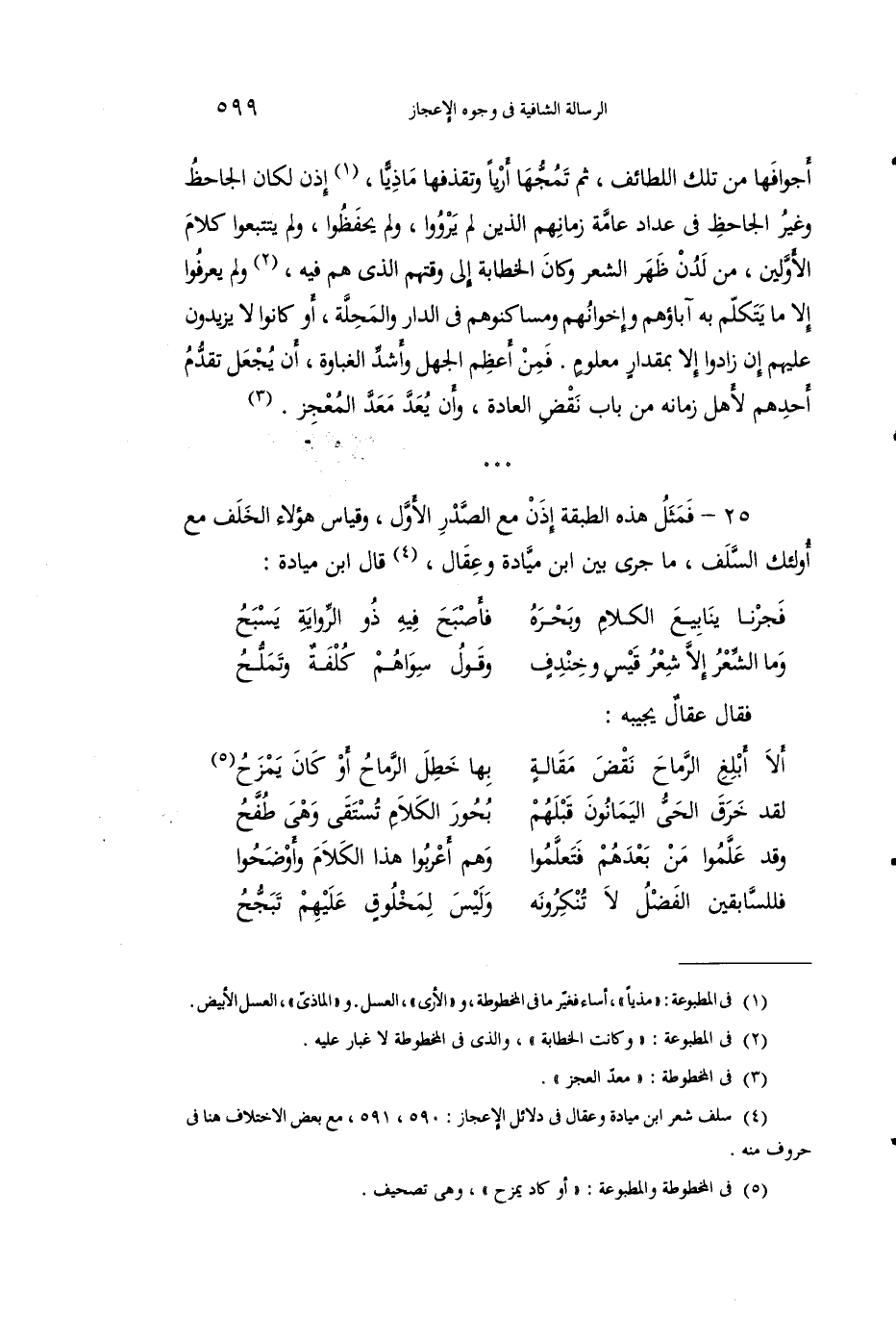 أجوافها من تلك اللطائف، ثم تمجها أربًا وتقذفها ماديًا1، إذن لكان الجاحظ وغير الجاحظ في عداد عامة زمانهم الذين لم يروا، ولم يحفظوا، ولم يتتبعوا كلام الأولين، من لدن ظهر الشعر وكان الخطابة إلى وقتهم الذي هم فيه2، ولم يعرفوا إلا ما يتكلم به آباؤهم وإخوانهم ومساكنوهم في الدار والمحلة، أو كانوا لا يزيدون عليهم إن زادوا بمقدار معلوم. فمن أعظم الجهل وأشد الغباوة، أن يجعل تقدم أحدهم لأهل زمانه من باب نقض العادة، وأن يعد معد المعجز3.