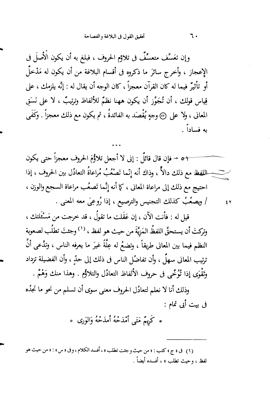 51 - فإنْ قالَ قائلٌ: إني لا أجعلُ تلاؤمَ الحروفِ مُعْجزاً حتى يكونَ اللفظُ مع ذلك دالا، وذاك أنه إنَّما تصعبُ مراعاةُ التعادلِ بينَ الحروفِ، إذا احتيجَ مع ذلك إلى مراعاةِ المعاني، كما أنه إنَّما تصْعبُ مراعاةُ السجعِ والوزنِ، ويصعبُ كذلك التجنيسُ والترصيعُ، إذا رُوعي معه المَعْنى.