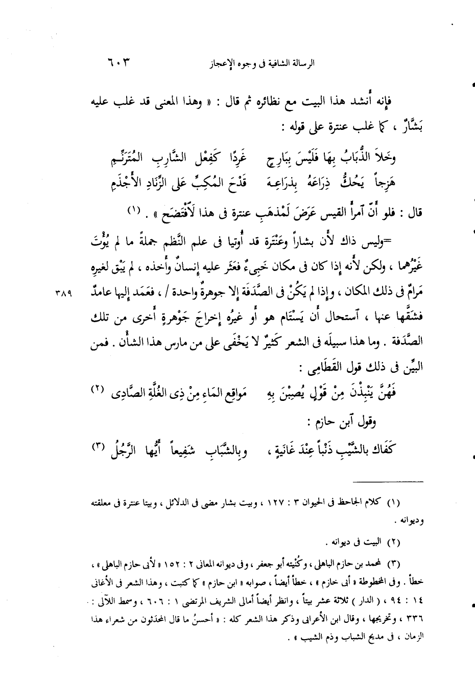 وليس ذاك لأن بشارًا وعنترة قد أوتيا في علم النظم جملة ما لم يوت غيرهما، ولكن لأنه إذا كان في مكان خبئ فعثر عليه إنسان وأخذهِ، لم يبق لغيره مرام في ذلك المكان، وإذا لم يكن في الصدقة إلا جوهرة واحدة، فعمد إليها عامد فشقها عنها، استحال أن يستام هو او غيره إخراج جوهرة أخرى من تلك الصدفة. وما هذا سبيله في الشعر كثي لا يخفى على من مارس هذا الشأن. فمن البين في ذلك قول القطامي: