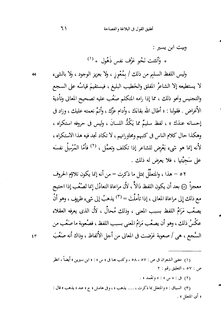 وليس اللّفظُ السليمُ من ذلك بِمُعْوِزٍ، ولا بعزيزِ الوجودِ، ولا بالشّيءِ لا يَستطيعُه إلاَّ الشاعرُ المُفْلِق والخطيبُ البليغ، فيستقيمَ قياسُه على السجعِ والتَّجنيس ونحوِ ذلك، مما إذا رامَه المتكلمُ صَعُبَ عليه تصحيحُ المعاني وتأديةُ الأغراض. فقولُنا: "أطالَ اللهُ بقاءك، وأدامَ عزَّك، وأَتمَّ نِعمتَهُ عليك، وزادَ في إحسانه عندَكَ"، لفْظٌ سليمٌ مما يَكُدُّ اللسانَ، وليس في حُروفه استكراهُ، وهكذا حالُ كلامِ الناس في كُتُبهم ومُحاوراتِهم، لا تكادُ تَجد فيه هَذا الاستكراهَ، لأنه إنَّما هو شيءٌ يَعْرِضُ للشّاعرِ إذا تكلَّف وتَعمَّل2، فأمَّا المُرْسِلُ نفْسَه على سَجيَّتها، فلا يَعْرض له ذلك.