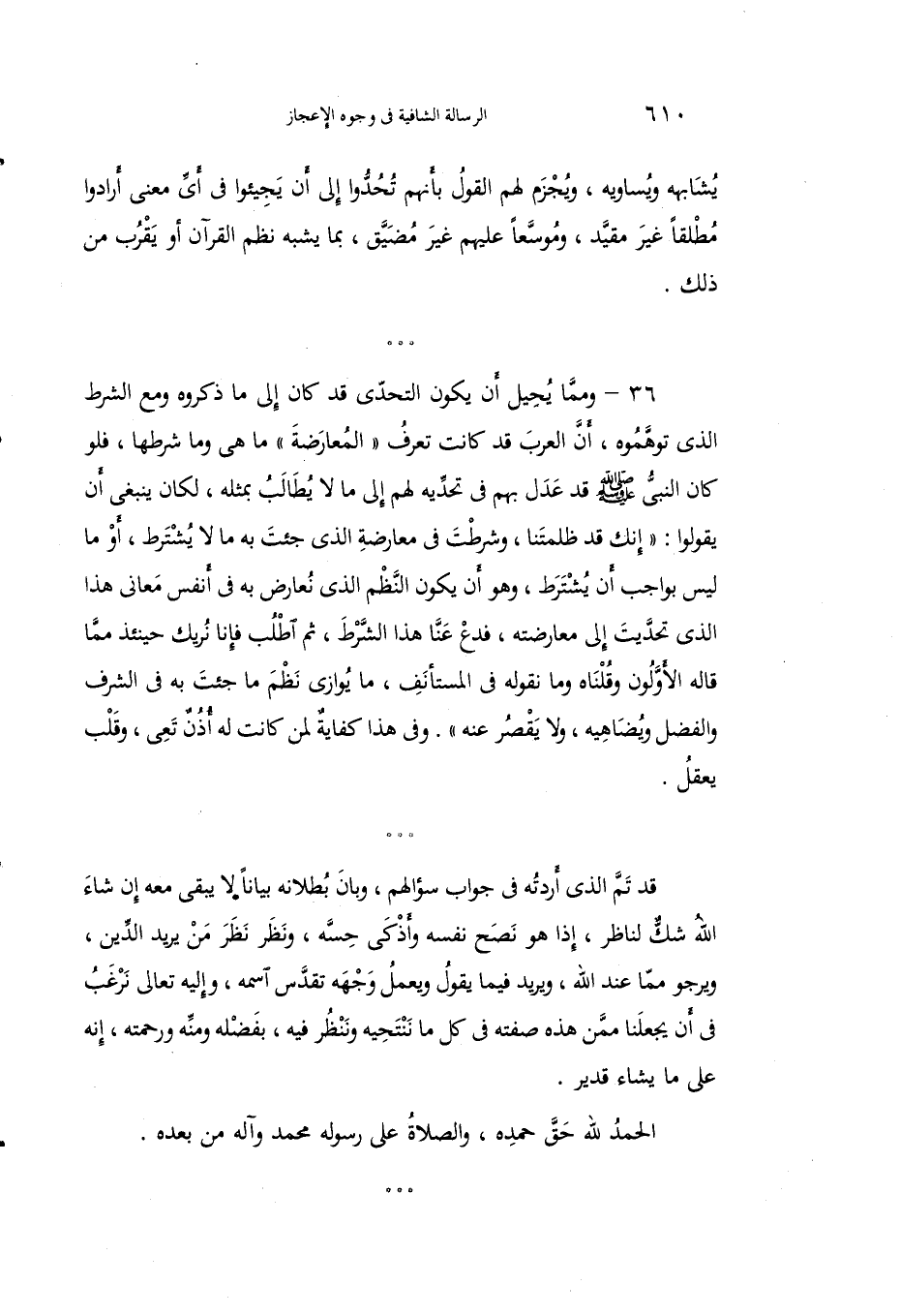 36 - ومما يحيل أن يكون التحدي قد كان إلى ما ذكروه ومع الشرط الذي توهموه، أن العرب قد كانت تعرف "المعارضة" ما هي وما شرطها، فلو كان النبي صلى الله عليه وسلم قد عدل بهم في تحديه لهم إلى ما لا يطالب بمثله، لكان ينبغي أن يقولوا: "إنك قد ظلمتنا، وشرطت في معارضة الذي جئت به ما لا يشترط، أو ما ليس بواجب أن يشترك، وهو أن يكون النظم الذي تعارض به في انفس معاني هذا الذي تحديت إلى معارضته، فدع عنا هذا الشرط، ثم اطلب فإنا نريك حينئذ مما قاله الأولون وقلناه وما نقوله في المستأنف، ما يوازي نظم ما جئت به في الشرف والفضل ويضاهيه، ولا يقصر عنه". وفي هذه كفاية لمن كانت له أذن نعي، وقلب يعقل.