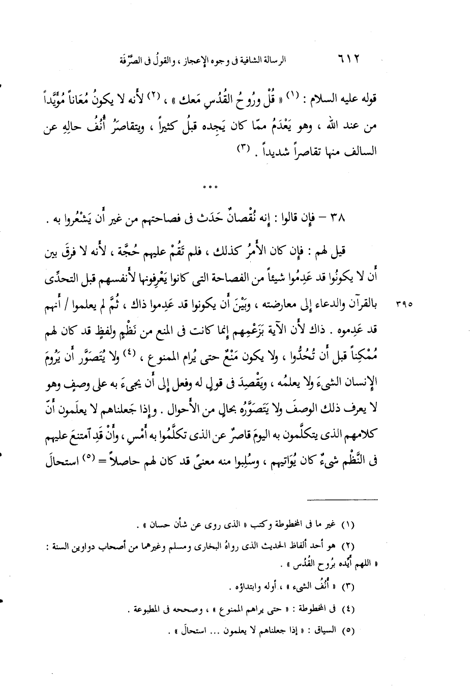 قيل لهم: فإن كان الأمر كذلك، فلم تقم عليهم حجة، لأنه لا فرق بين أن لا يكونوا قد عدموا شيئا من الفصاحة التي كانوا يعرفونها لأنفسهم قبل التحدي بالقرآن والدعاء إلى معارضته، وبين أن يكونوا قد عدموا ذاك، ثم لم يعلموا أنهم قد عدموه. ذاك لأن الآية بزعمهم إنما كانت في المنع من نظم ولفظ قد كان لهم ممكنًا قبل أن تحدوا، ولا يكون منع حتى يرام الممنوع4، ولا يتصور أن يروم الإنسان الشيء ولا يعلمه، ويقصد في قوله له وفعل إلى أن يجيء به على وصف وهو لا يعرف ذلك الوصف ولا يتصوره بحال من الأحوال. وإذا جعلناهم لا يعلمون أن كلامهم الذي يتكلمون به اليوم قاصر عن الذي تكلموا به أمس، وأن قد امتنع عليهم في النظم شيء كان يواتيهم، وسلبوا منه معنى قد كان لهم حاصلًا5 استحال