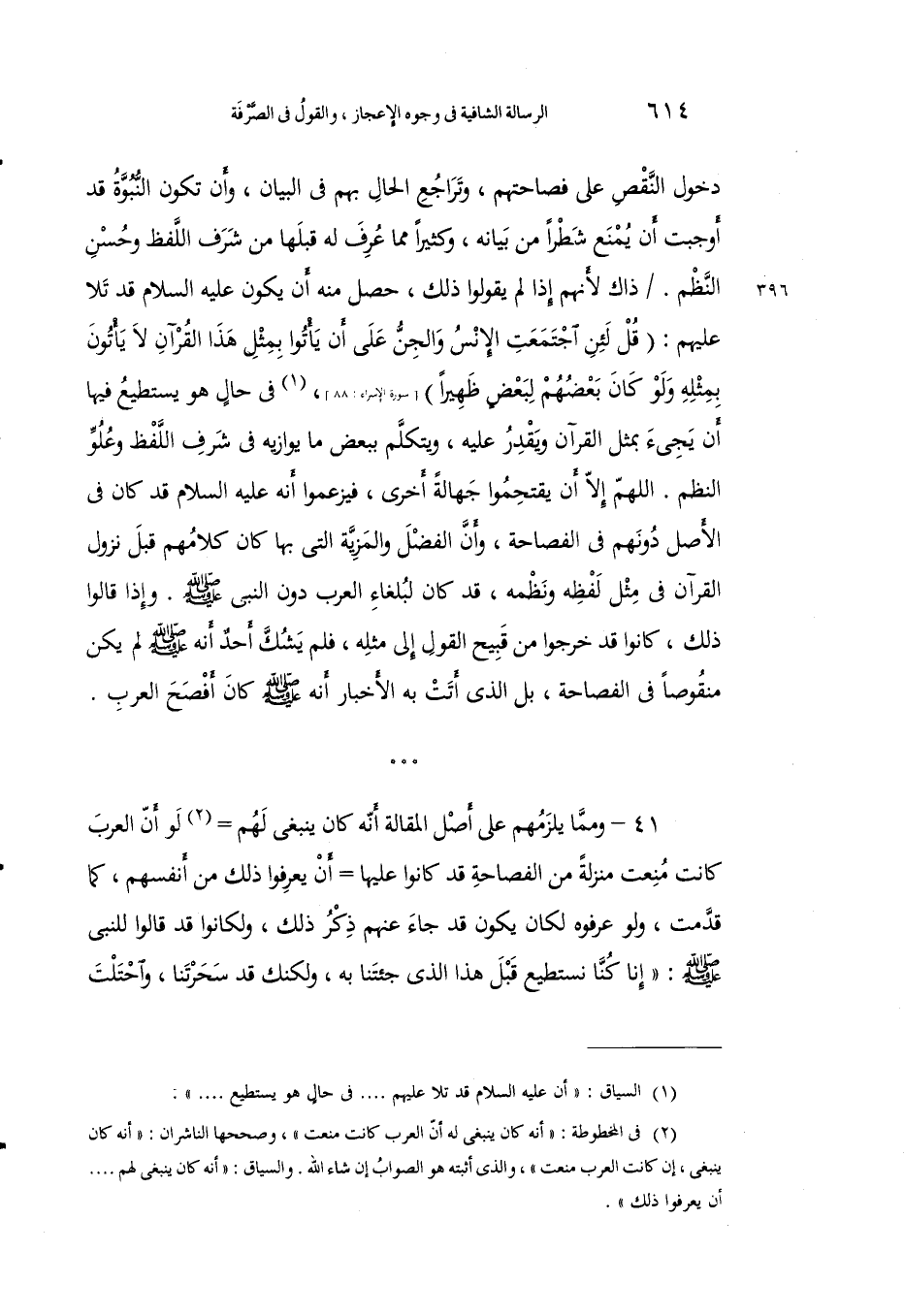 دخول النقص على فصاحتهم، وتراجع الحال بهم في البيان، وأن تكون النبوة قد أوجبت أن يمنع شطرًا من بيانه، وكثيرا مما عرف له قبلها من شرف اللفظ وحسن النظم. وذلك لأنهم ذا لم يقولوا ذلك، حصل منه أنيكون عليه السلام قد تلا عليهم: {قُلْ لَئِنِ اجْتَمَعَتِ الْأِنْسُ وَالْجِنُّ عَلَى أَنْ يَأْتُوا بِمِثْلِ هَذَا الْقُرْآنِ لاَ يَأْتُونَ بِمِثْلِهِ وَلَوْ كَانَ بَعْضُهُمْ لِبَعْضٍ ظَهِيرًا} [الإسراء: 88] 1، في حال هو يستطيع يها أن يجيء بمثل القرآن ويقدر عليه، ويتكلم ببعض ما يوازيه في شرف اللفظ وعلو النظم. اللهم إلا أن يقتحموا جهالة أخرى، فيزعموا أنه عليه السلام قد كان من الأصل دونهم في الفصاحة، وأن الفضل والمزية التي بها كان كلامهم قبل نزول القرآن في مثل لظفه ونظمه، قد كان لبلغاء العرب دون النبي صلى الله عليه وسلم. وإذا قالوا ذلك، كانوا قد خرجوا من قبيح القول إلى مثله، فلم يشك أحد أنه صلى الله عليه وسلم لم يكن منقوصًا في الفصاحة، بل الذي أتت به الأخبار أنه صلى الله عليه وسلم كان أفصحَ العرب.