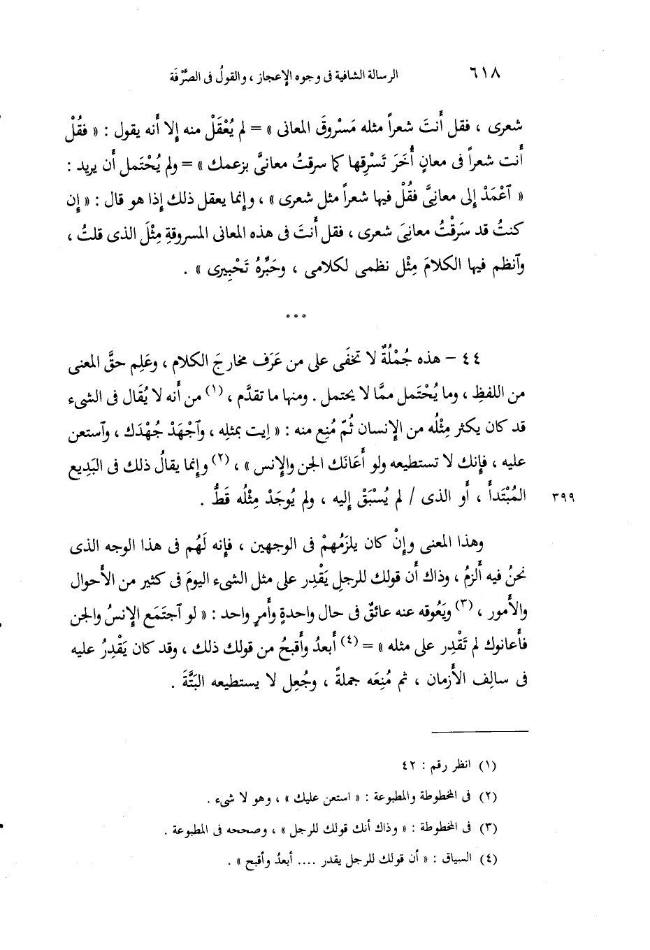 44 - هذه جملة لا تخفي على من عرف مخارج الكلام، وعلم حق المعنى من اللفظ، وما يحتمل مما لا يحتمل. ومنها ما تقدم1، من أنه لا يقال في الشيء قد كان يكثر مثله من الإنسان ثم منع منه: "ايت بمثله، وأجهد جهدك، واستعن عليه، فإنك لا تستطيع ولو أعانك الجن والإنس"2، وإنما يقال ذلك في البديع المتبدأ، أو الذي لم يسبق إليه، ولم يوجد مثله قط.