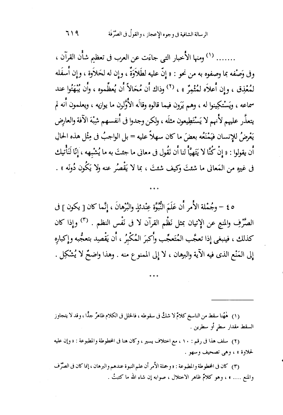 45 - وجملة الأمر أن علم النبوة عندئذ والبرهان، إنما كان [يكون] في الصرف والمنع عن الإتيان بمثل نظم القرآن لا في نفس النظم3. وإذا كان كذلك، فينبغي إذا تعجب المتعجب وأكبر المكبر، أن يقصد بتعجبه وإكباره إلى المنع الذي فيه الآية والبرهان، لا إلى الممنوع منه. وهذا واضح لا يشكل.