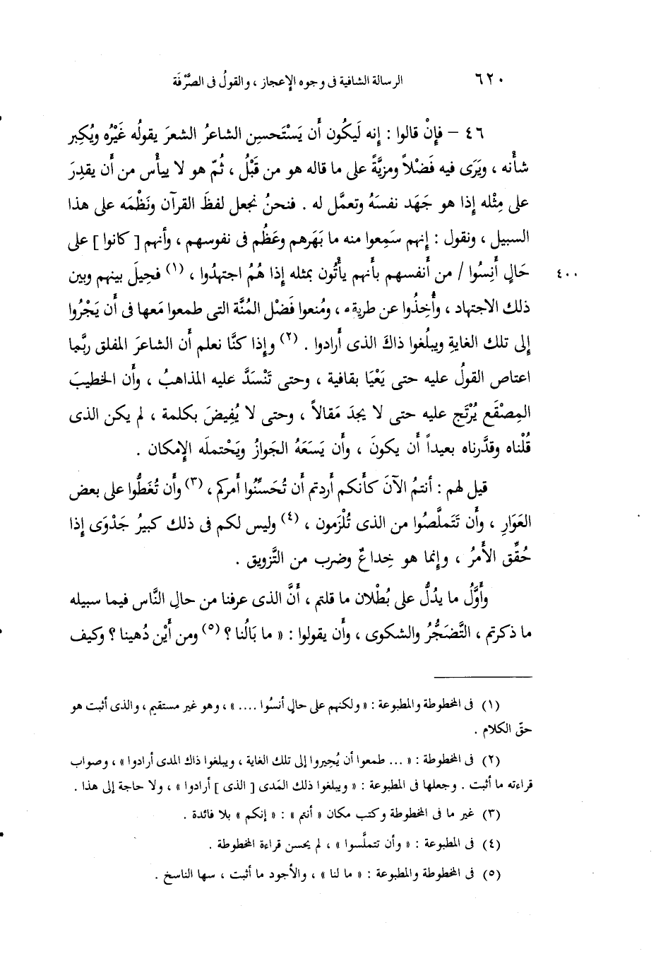46 - فإن قالوا: إنه ليكون أن يستحسن الشاعر الشعر يقوله غيره ويكبر شأنه، ويرى فيه فضلًا ومزية على ما قاله هو من قبل، ثم هو لا ييأس من أن يقدر على مثله إذا هو جهد نفسه وتعمل له. فنحن نجعل لفظ القرآن ونظمه على هذا السبيل، وتقول: إنهم سمعوا منه ما بهرهم وعم في نفوسهم، وأنهم [كانوا على حال أنسوا من أنفسهم بأنهم يأتون بمثله إذا هم اجتهدوا1، فحيل بينهم وبين ذلك الاجتهاد، وأخذوا عن طريقه، ومنعوا فضل المنة التي طمعوا معها في أن يجروا إلى تلك الغاية ويبلغوا ذاك الذي أرادوا2 وإذا كنا نعلم أن الشعر المفلق ربما اعتاص القول عليه حتى عييا بقافية، وحتى تنسد عليه المذاهب، وأن الخطيب المصقع يرتج عليه حتى لا يجد مقالًا، وحتى لا يفيض بكلمة، لم يكن الذي قلناه وقدرناه بعيدًا أن يكون، وأن يسعة الجواز ويحتمله الإمكان.