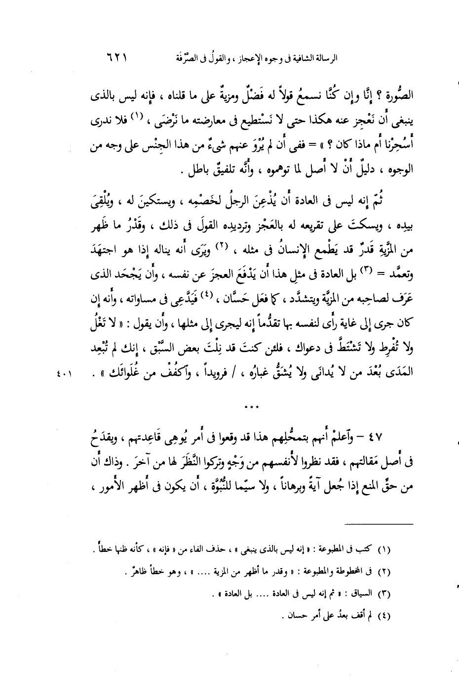 47 - واعلم أنهم يتمحلهم هذا قد وقعوا في امر يوهي قاعدتهم، ويقدح في أصل مقالتهم، فقد نظروا لأنفسهم من وجه وتركوا النظر لها من آخر. وذاك أن من حق المنع إذا جعل آية وبرهانًا، ولا سيما للنبوة، أن يكون في اظهر الأمور،