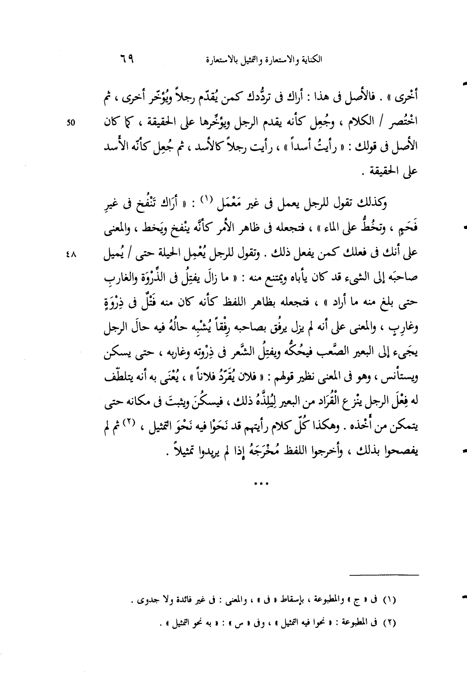 وكذلك تقولُ للرجل يَعْمَل في غيرَ مَعْمَل1: "أَراك تَنفُخُ في غير فحمٍ، وتَخُطُّ على الماء"، فَتجْعلُه في ظاهرِ الأمرِ كأنه ينفخ ويخط، والمعنى على ذلك أنك في فِعْلِك كمنْ يَفْعل ذلك، وتقولُ للرَّجلِ يُعمِلُ الحيلةَ حتى يُميلَ صاحبَه إلى الشَّيءِ قد كان يأباهُ ويَمْتنعُ منه: "ما زال يَفْتِل في الذِّروة والغارِب حتى بَلغَ منهُ ما أَراد"، فتَجْعلُه بظاهرِ اللّفظِ كأنه كان منهُ فَتْلٌ في ذِرْوَةٍ وغاربٍ، والمعنى على أنَّهُ لم يَزَلْ يَرْفِقُ بصاحبهِ رِفْقاً يُشبهُ حالُه فيه حالَ الرجل يَجيء إلى البعيرِ الصَّعْب فيَحكُّه ويفتلُ الشَّعرَ في ذروتِه وغاربِه، حتى يَسْكنَ ويَسْتأنسَ، وهو في المعنى نَظيرُ قولهم "فلان يقرد فلاناً" يعنى به أن يتطلف له فعلَ الرجلِ يَنْزَعُ القُرادَ منَ البعيرِ ليلذَّهُ ذلك، فيَسْكُن ويَثْبتُ في مكانه حتى يتمكَّن من أَخْذه، وهكذا كل كلامٍ رأيتَهم قد نحوا فيه نحو التّمثيلَ2، ثم لم يُفْصحوا بذلك، وأَخرجوا اللَّفظَ مخرَجَه إذا لم يريدوا تمثيلًا.