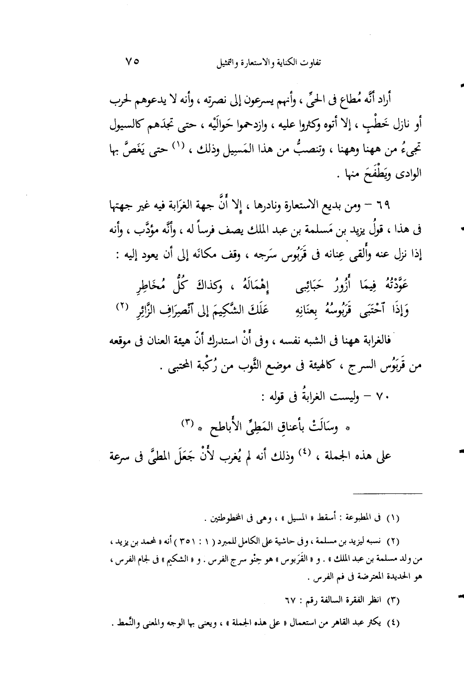 69 - ومن بديعِ الاستعارةِ ونادرِها، إِلا أن جهةَ الغرابةِ فيهِ غيرُ جهتِها في هذا، قولُ يزيدَ بنِ مَسلمة بنِ عبدِ الملكِ يصفُ فَرساً له، وأَنَّه مُؤدَّبٌ، وأنه إِذا نزَلَ عنه وألقَى عِنانَه في قَرَبوس سَرْجه، وقفَ مكانَه إِلى أن يعودَ إليه: