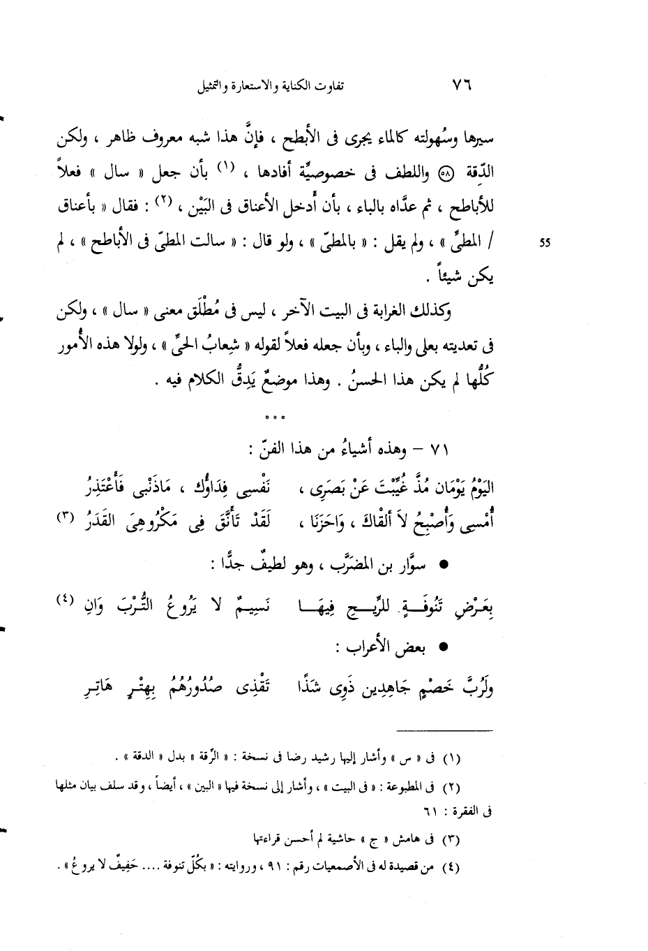 سيرِها وسهولتهِ كالماءِ يجري في الأَبْطُحِ، فإنَّ هذا شَبَهٌ معروفٌ ظاهر، ولكنَّ الدِّقةَ واللطفَ في خصوصيةٍ أفادَها1، بأنْ جعَلَ "سال" فعلاً للأباطحِ، ثم عدَّاه بالباءِ، ثم بأَن أدخلَ الأعناقَ في البين2، فقال: "بأعناقِ المطيِّ"، ولم يَقُلْ: "بالمطيِّ"، ولو قالَ: "سالتِ المطيُّ في الأَباطح"، لم يَكُنْ شيئاً.