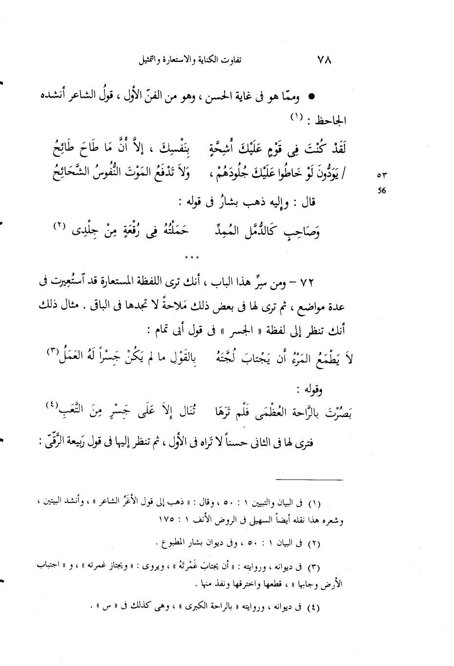72 - ومن سرِّ هذا البابِ، أنك تَرى اللفظَة المستعارةَ قد استُعيرتْ في عدَّةِ مواضعَ، ثم تَرى لها في بعضِ ذلك مَلاحةً لا تَجِدُها في الباقي. مثالُ ذلك أنك تَنْظر إلى لفظةِ "الجِسر" في قولِ أبي تمام: