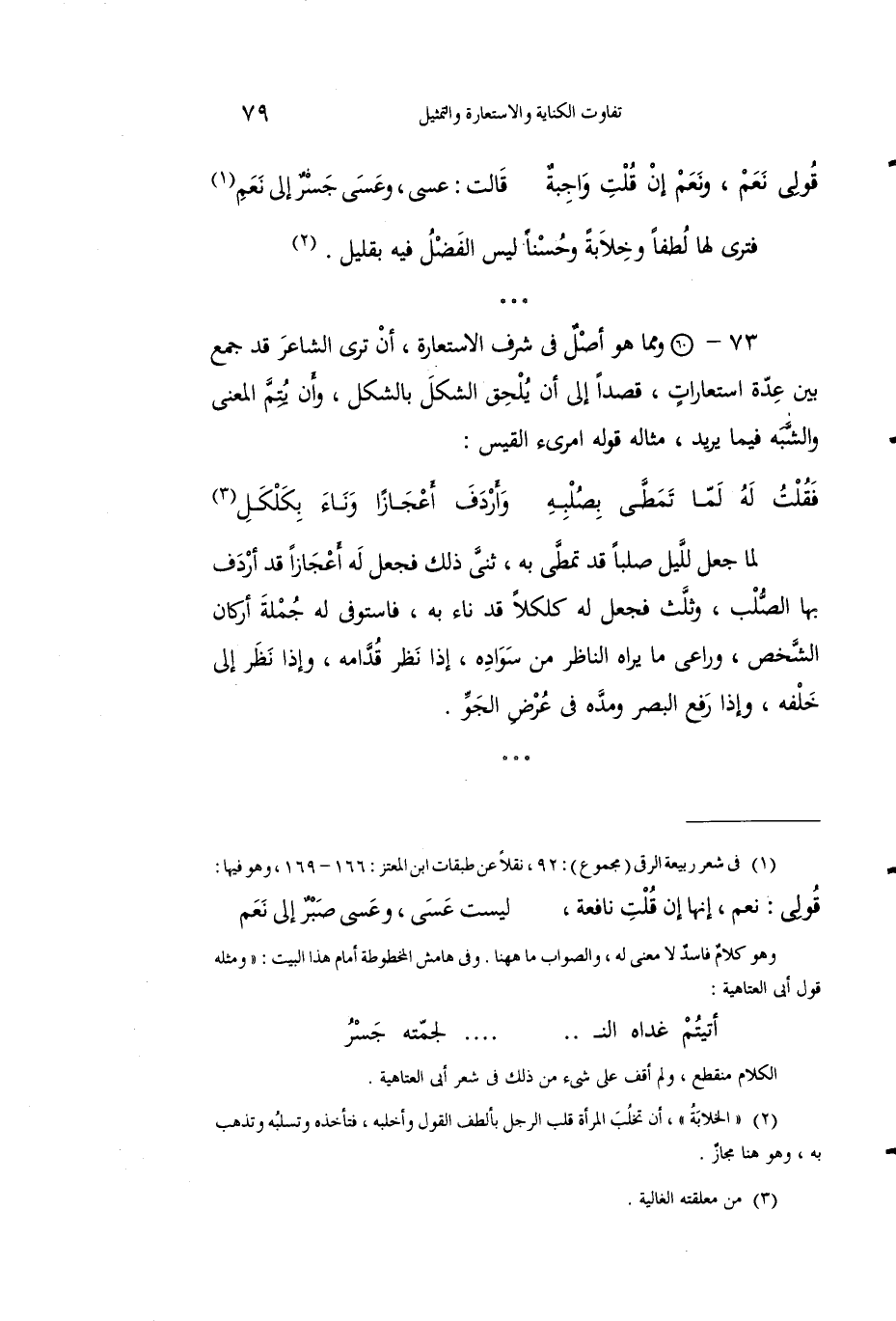 73 - ومما هو أَصْلٌ في شرَف الاستعارة، أنْ تَرى الشاعرَ قد نجمع بين عدةِ استعاراتٍ، قَصْداً إِلى أَنْ يُلحقَ الشكلَ بالشَّكْلِ، وأن يُتِمَّ المعنى والشَّبهَ فيما يريد، مثاله قول امرئ القيس: