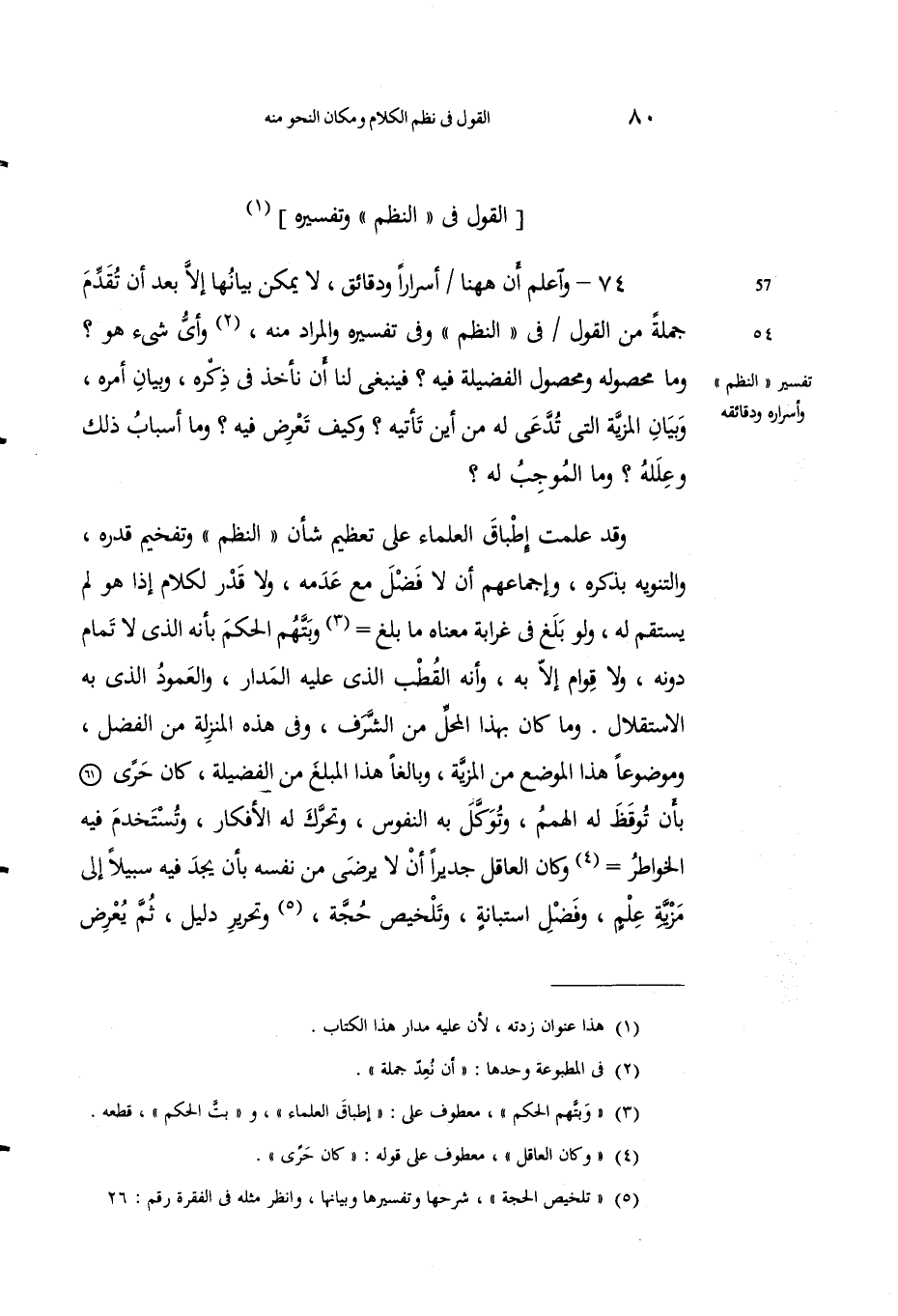 74 - واعلم أن ههنا: أسراراً ودقائقَ، لا يُمكن بَيانُها إلاَّ بَعْد أن تقدم جملةً منَ القول في "النَّظم" وفي تفسيرهِ والمُراد منه2، وأيِّ شيءٍ هو؟ وما محصولُه ومحصولُ الفضيلةِ فيه؟ فينبغي لنا أن نأْخُذَ من ذِكْرِه، وبَيان أَمره، وبيانِ المزيَّةِ التي تُدَّعى له مِنْ أينَ تَأْتيه؟ وكيفَ تَعْرِضُ فيه؟ وما أَسبابُ ذلك وعِلَلُه؟ وما المُوجِبُ له؟.