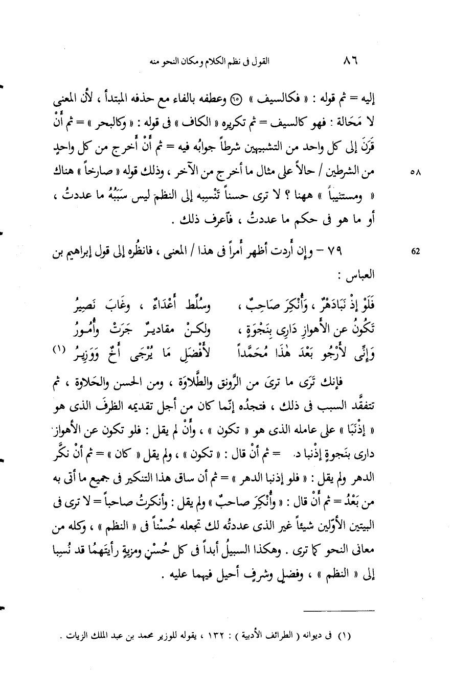 79 - وإِن أردتَ أَظْهرَ أمراً في هذا المعنى، فانظره إِلى قولِ إِبراهيمَ بنِ العَبّاس: