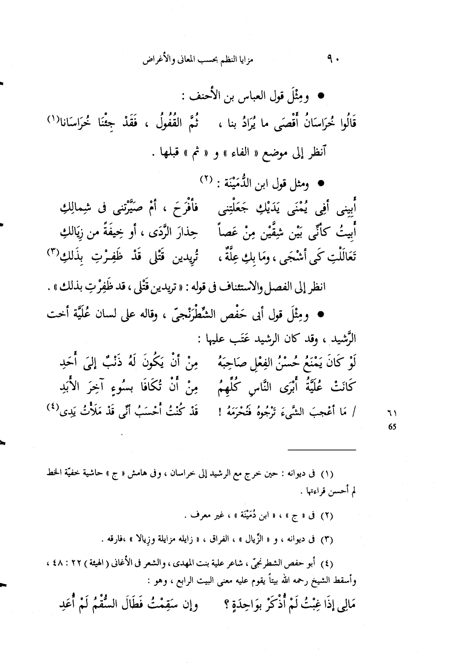 4 أبو حفص الشطرنجي، شاعر علية بنت المهدي، والشعر في الأغاني "الهيئة" 22: 48، وأسقط الشيخ رحمه الله بيتًا يقوم عليه معنى البيت الرابع، وهو: