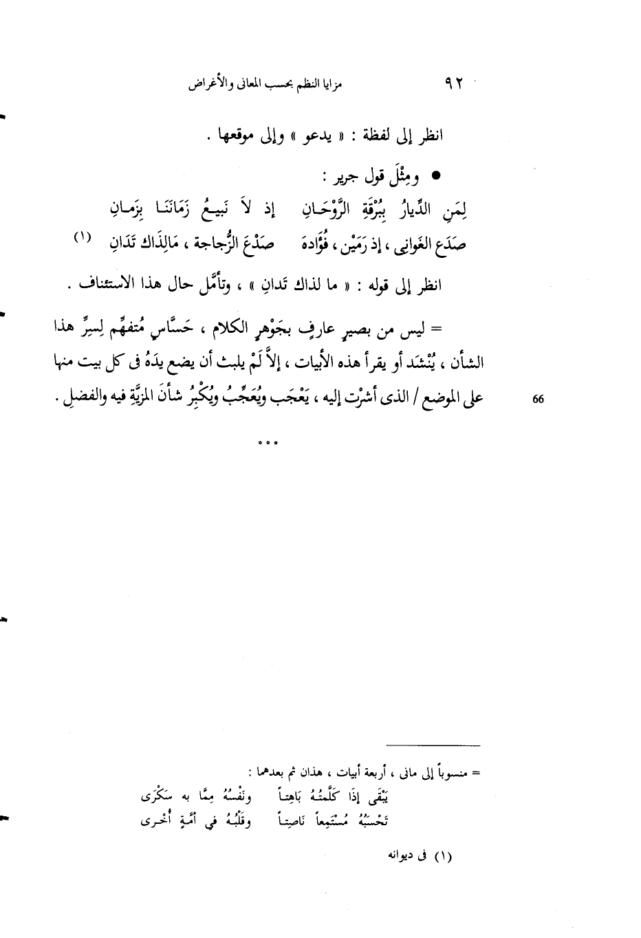 ليس من بصيرٍ عارفٍ بجوهر الكلام، حسَّاس مُتفهِّم لسرِّ هذا الشأنِ، يُنْشِدُ أو يَقرأ هذه الأبياتَ، إلاَّ لم يلبثْ أَنْ يضَعَ يدَه في كلَّ بيتٍ منها على الموضِع الذي أشرتُ إليه، يَعْجَبُ ويُعَجِّب ويُكْبِر شأنَ المزيةِ فيه والفضْلَ.