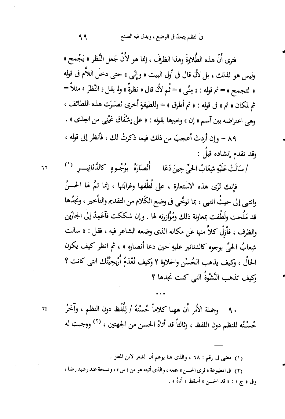 فإنَّكَ تَرى هذه الاستعارة، على لُطْفها وغَرابتها، إِنَّما تَمَّ لها الحسْنُ وانتهى إِلى حيثُ انتهى، بما تُوخِّيَ في وضْع الكلامِ من التقديمِ والتأخيرِ، وتَجدُها قد مَلُحَتْ ولَطُفتْ بمعاونةِ ذلك ومؤازرتِه لها. وإن شكَكْتَ فاعمدْ إِلى الجارَّيْن والظَّرْف، فأَزِلْ كلآ منها عن مكانِه الذي وضَعَه الشاعرُ فيه، فقلْ: "سالتْ شعابُ الحيَّ بوجوهٍ كالدَّنانير عليه حين دعا أنصارَهُ"، ثم انظرْ كيفَ يكونُ الحالُ، وكيف يَذهبُ الحسْنُ والحلاوةُ؟ وكيف تَعْدَم أرْيَحِيَّتَكَ التي كانت؟ وكيف تَذْهب النشوةُ التي كُنتَ تجدُها؟