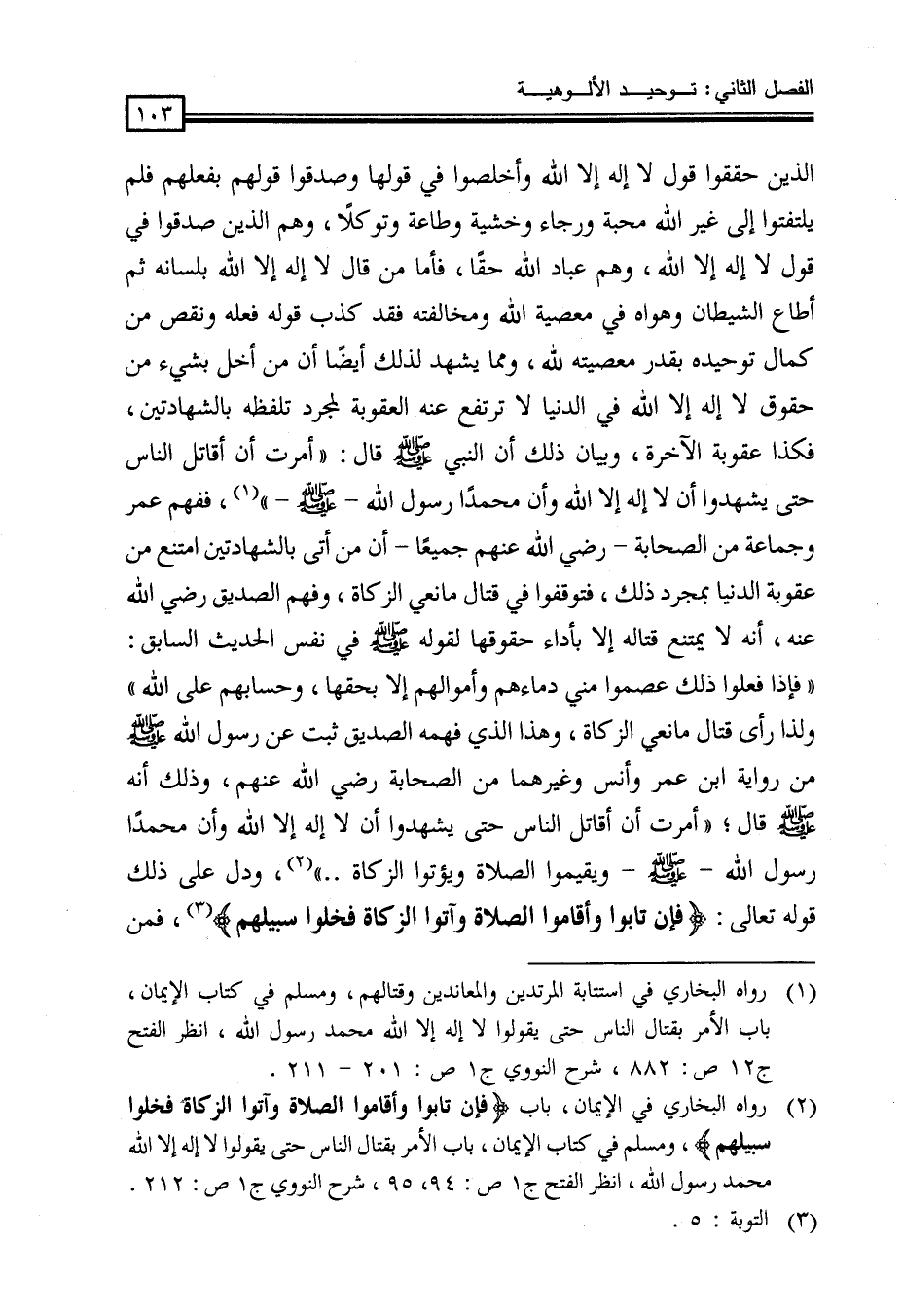 (¬2) رواه البخاري قي الإيمان، باب {فَإِنْ تَابُوا وَأَقَامُوا الصَّلَاةَ وَآتَوُا الزَّكَاةَ فَخَلُّوا سبيلهم} ، ومسلم في كتاب الإيمان، باب الأمر بقتال النَّاسَ حَتَّى يَقُولُوا لَا إِلَهَ إِلَّا اللَّهُ محمد رسول الله، انظر الفتح ج1ص: 94، 95، شرح النووي ج 1ص: 212..