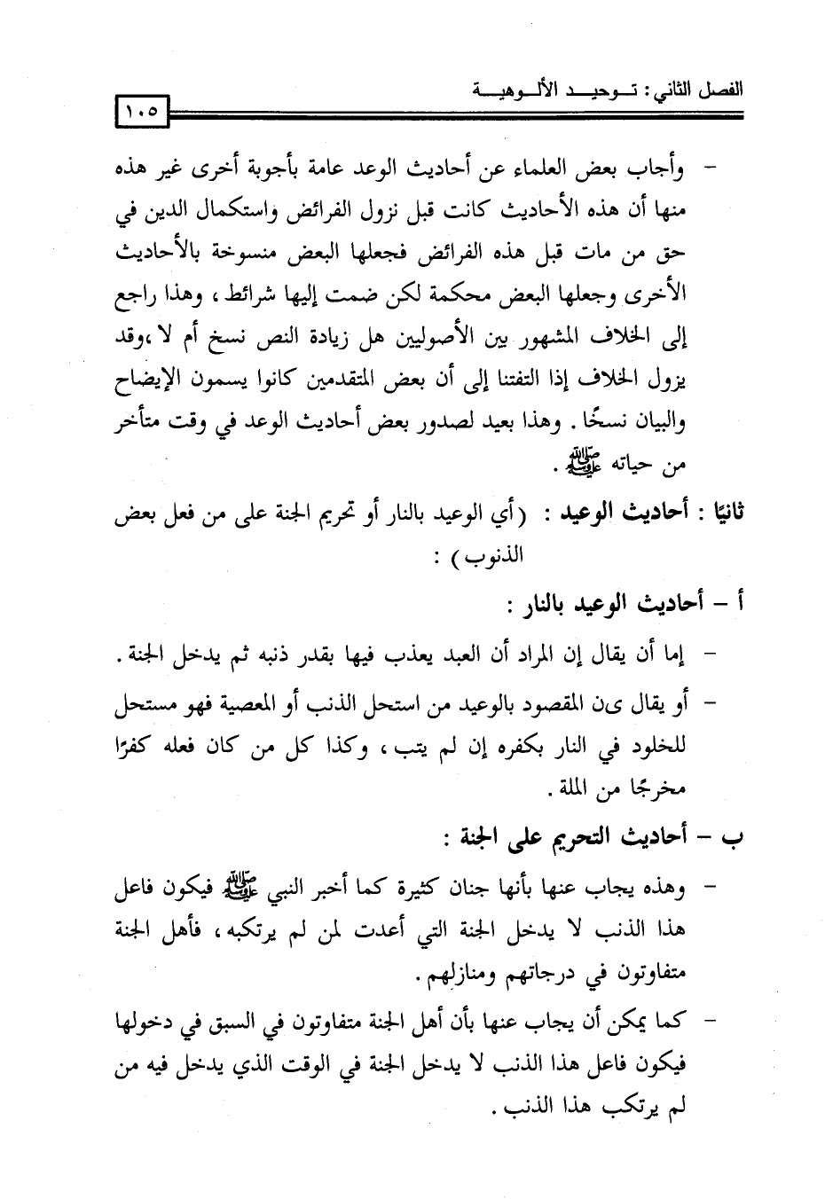 ثانياً: أحاديث الوعيد: (أي الوعيد بالنار أو تحريم الجنة على من فعل بعض الذنوب) :