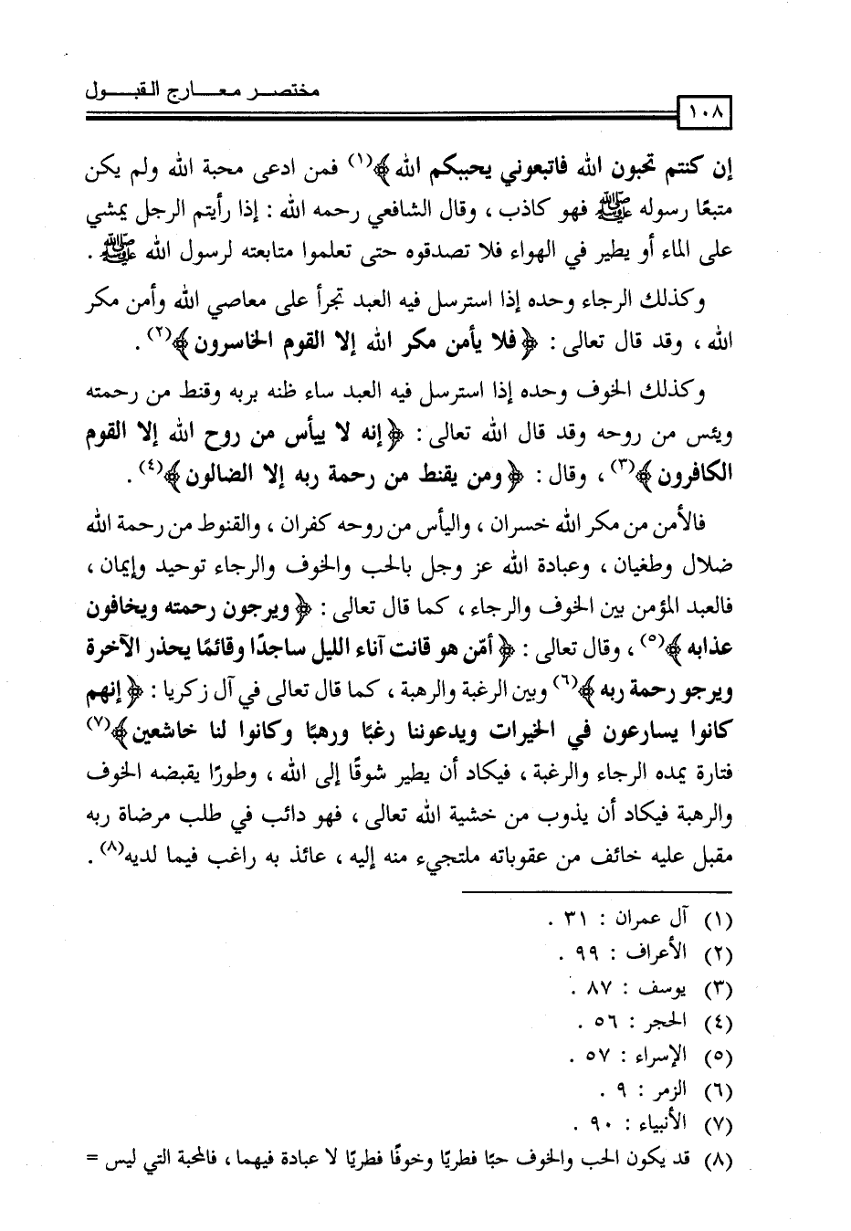 فَالْأَمْنُ مِنْ مَكْرِ اللَّهِ خُسْرَانٌ، وَالْيَأْسُ مِنْ رَوْحِهِ كُفْرَانٌ، وَالْقُنُوطُ مِنْ رَحْمَةِ اللَّهِ ضَلَالٌ وَطُغْيَانٌ، وَعِبَادَةُ اللَّهِ عَزَّ وَجَلَّ بِالْحُبِّ وَالْخَوْفِ وَالرَّجَاءِ تَوْحِيدٌ وَإِيمَانٌ، فَالْعَبْدُ الْمُؤْمِنُ بَيْنَ الْخَوْفِ وَالرَّجَاءِ، كَمَا قَالَ تَعَالَى: {وَيَرْجُونَ رَحْمَتَهُ وَيَخَافُونَ عذابه} (¬5) ، وَقَالَ تَعَالَى: {أَمَّنْ هُوَ قَانِتٌ آنَاءَ اللَّيْلِ ساجداً وقائماً يحذر الآخرة ويرجوا رحمة ربه} (¬6) وَبَيَّنَ الرَّغْبَةَ وَالرَّهْبَةَ، كَمَا قَالَ تَعَالَى فِي آل زكريا: {إِنَّهُمْ كَانُوا يُسَارِعُونَ فِي الْخَيْرَاتِ وَيَدْعُونَنَا رَغَبًا ورهباً وكانوا لنا خاشعين} (¬7)