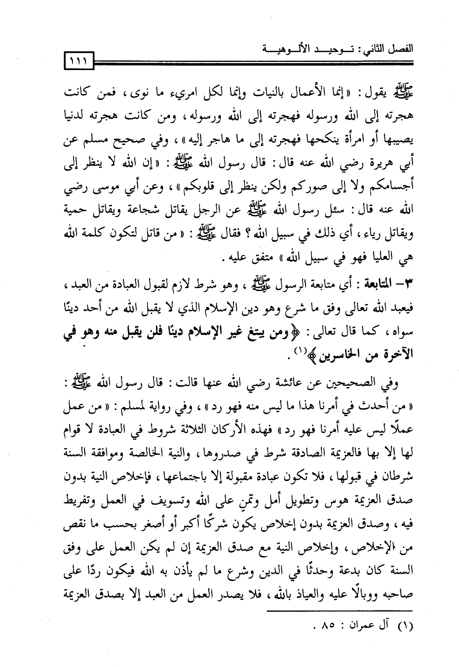وَفِي الصَّحِيحَيْنِ عَنْ عَائِشَةَ رَضِيَ اللَّهُ عَنْهَا قَالَتْ: قَالَ رَسُولُ اللَّهِ - صَلَّى اللَّهُ عَلَيْهِ وَسَلَّمَ -: (مَنْ أَحْدَثَ فِي أَمْرِنَا هَذَا مَا لَيْسَ مِنْهُ فَهُوَ رَدٌّ) ، وَفِي رِوَايَةٍ لِمُسْلِمٍ: (مَنْ عَمِلَ عَمَلًا لَيْسَ عَلَيْهِ أَمَرُنَا فَهُوَ رد) فهذه الأركان الثلاثة شُرُوطٌ فِي الْعِبَادَةِ لَا قِوَامَ لَهَا إِلَّا بِهَا فَالْعَزِيمَةُ الصَّادِقَةُ شَرْطٌ فِي صُدُورِهَا، وَالنِّيَّةُ الخالصة وموافقة السنة شرطان فِي قَبُولِهَا، فَلَا تَكُونُ عِبَادَةً مَقْبُولَةً إِلَّا بِاجْتِمَاعِهَا، فَإِخْلَاصُ النِّيَّةِ بِدُونِ صِدْقِ الْعَزِيمَةِ هَوَسٌ وَتَطْوِيلُ أَمَلٍ وتمنٍ عَلَى اللَّهِ وَتَسْوِيفٌ فِي الْعَمَلِ وَتَفْرِيطٌ فِيهِ، وَصِدْقُ الْعَزِيمَةِ بِدُونِ إِخْلَاصٍ يَكُونُ شِرْكًا أَكْبَرَ أَوْ أَصْغَرَ بِحَسَبِ مَا نقص من الإخلاص، وإخلاص النية إن لم يكن العمل وفق السنة كان بدعاً وحدثاً في الدين وشرع ما لَمْ يَكُنِ الْعَمَلُ عَلَى وَفْقِ السُّنَّةِ كَانَ بدعاً وَحَدَثًا فِي الدِّينِ وَشَرْعَ مَا لَمْ يَأْذَنِ به الله فَيَكُونُ رَدًّا عَلَى صَاحِبِهِ وَوَبَالًا عَلَيْهِ وَالْعِيَاذُ بِاللَّهِ، فَلَا يَصْدُرُ الْعَمَلُ مِنَ الْعَبْدِ إِلَّا بصدق العزيمة