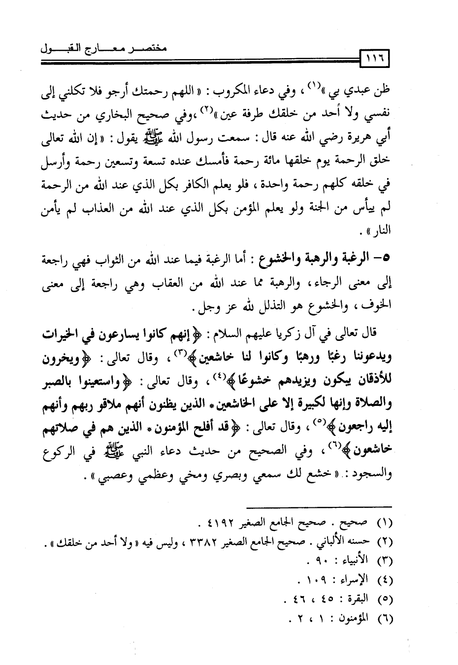 5-الرغبة والرهبة والخشوع: أما الرغبة فيما عند الله من الثواب فهي راجعة إلى معنى الرَّجَاءِ، وَالرَّهْبَةِ مِمَّا عِنْدَ اللَّهِ مِنَ الْعِقَابِ وَهِيَ رَاجِعَةٌ إِلَى مَعْنَى الْخَوْفِ، وَالْخُشُوعُ هُوَ التَّذَلُّلُ لِلَّهِ عَزَّ وَجَلَّ.