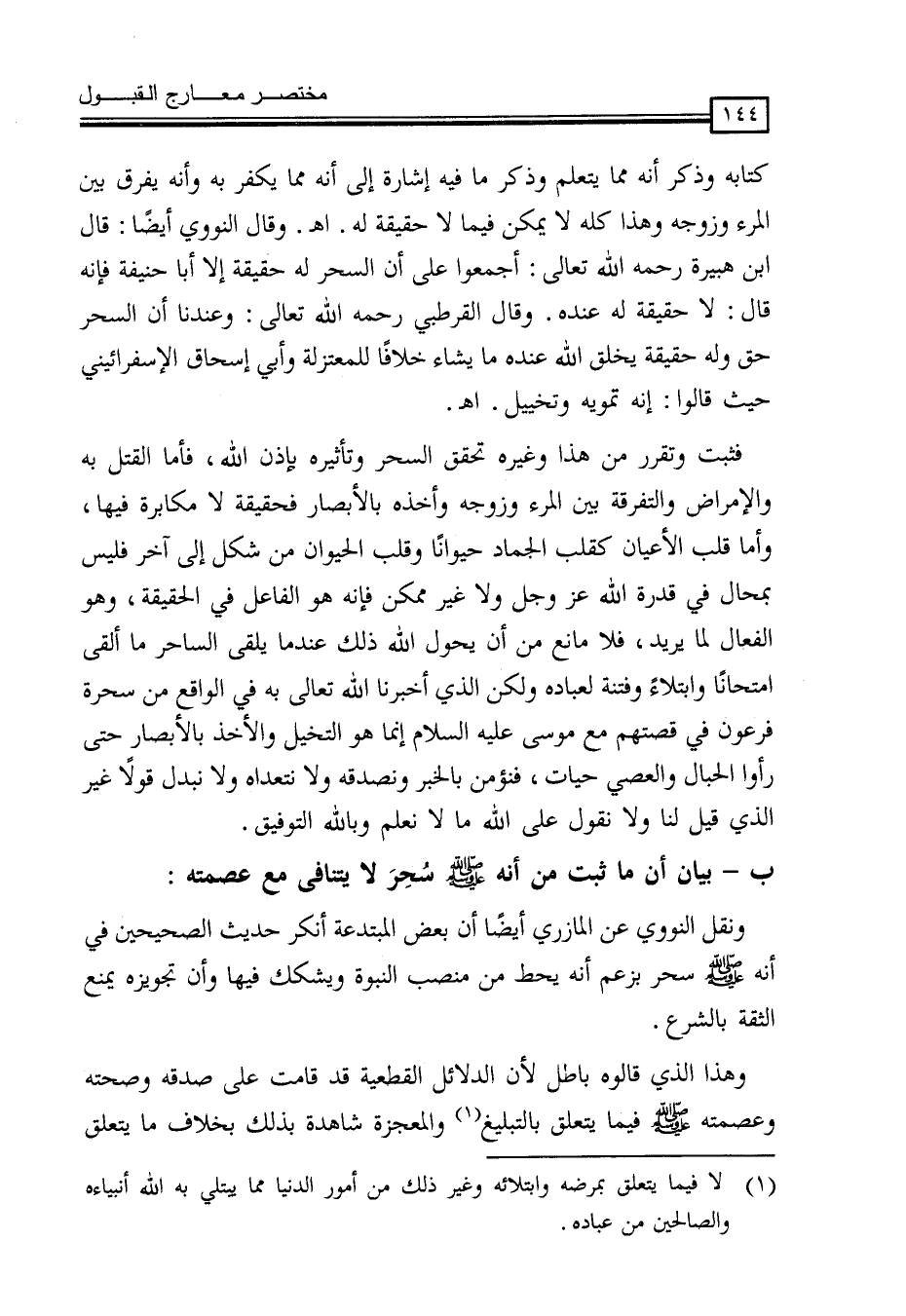 ونقل النووي عن المازري أيضاً أن بعض المبتدعة أنكر حديث الصحيحين في أنه - صلى الله عليه وسلم - سحر بزعم أَنَّهُ يَحُطُّ مِنْ مَنْصِبِ النُّبُوَّةِ وَيُشَكِّكُ فِيهَا وَأَنَّ تَجْوِيزَهُ يَمْنَعُ الثِّقَةَ بِالشَّرْعِ.