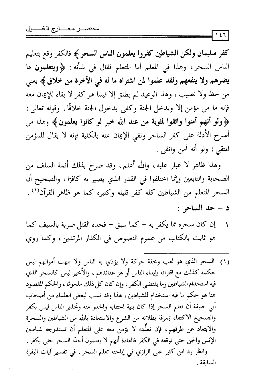 كَفَرَ سُلَيْمَانُ وَلَكِنَّ الشَّيَاطِينَ كَفَرُوا يُعَلِّمُونَ النَّاسَ السحر} فالكفر وقع بتعليم الناس السحر، وهذا في المعلم أما المتعلم فقال في شأنه: {وَيَتَعَلَّمُونَ مَا يَضُرُّهُمْ وَلَا يَنْفَعُهُمْ وَلَقَدْ عَلِمُوا لَمَنِ اشْتَرَاهُ مَا لَهُ فِي الْآخِرَةِ مِنْ خلاق} يَعْنِي مِنْ حَظٍّ وَلَا نَصِيبٍ، وَهَذَا الْوَعِيدُ لَمْ يُطْلَقْ إِلَّا فِيمَا هُوَ كُفْرٌ لَا بَقَاءَ لِلْإِيمَانِ مَعَهُ فَإِنَّهُ مَا مِنْ مُؤْمِنٍ إلا ويدخل الجنة وكفى بدخول الجنة خلاقاً. وقوله تعالى: {وَلَوْ أَنَّهُمْ آمَنُوا وَاتَّقَوْا لَمَثُوبَةٌ مِنْ عِنْدِ الله خير لو كانوا يعلمون} وَهَذَا مِنْ أَصْرَحِ الْأَدِلَّةِ عَلَى كُفْرِ السَّاحِرِ وَنَفْيِ الْإِيمَانِ عَنْهُ بِالْكُلِّيَّةِ فَإِنَّهُ لَا يُقَالُ للمؤمن المتقي: ولو آمن واتقى.