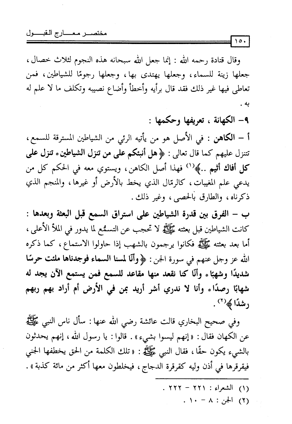 وَفِي صَحِيحِ الْبُخَارِيِّ قَالَتْ عَائِشَةُ رَضِيَ اللَّهُ عَنْهَا: سَأَلَ نَاسٌ النَّبِيَّ - صَلَّى اللَّهُ عَلَيْهِ وَسَلَّمَ - عَنِ الْكُهَّانِ فَقَالَ: (إِنَّهُمْ لَيْسُوا بِشَيْءٍ) . قَالُوا: يَا رَسُولَ اللَّهِ، إِنَّهُمْ يُحَدِّثُونَ بِالشَّيْءِ حَقًّا، فَقَالَ النَّبِيُّ - صَلَّى اللَّهُ عَلَيْهِ وَسَلَّمَ -: (تلك الكلمة من الحق يخطفها الْجِنِّيُّ فَيُقَرْقِرُهَا فِي أُذُنِ وَلَيِّهِ كَقَرْقَرَةِ الدَّجَاجِ، فيخلطون معها أكثر من مائة كذبة) .