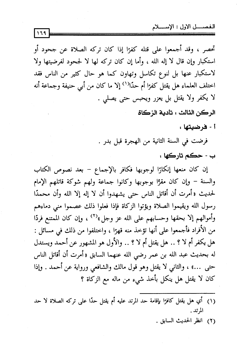 الزَّكَاةَ فَإِذَا فَعَلُوا ذَلِكَ عَصَمُوا مِنِّي دِمَاءَهُمْ وَأَمْوَالَهُمْ إِلَّا بحقها وحسابهم على الله عز وجل) (¬2) ، وإن كان الممتنع فَرْدًا مِنَ الْأَفْرَادِ فَأَجْمَعُوا عَلَى أَنَّهَا تُؤْخَذُ مِنْهُ قَهْرًا، وَاخْتَلَفُوا مِنْ ذَلِكَ فِي مَسَائِلَ: هل يكفر أم لا؟ .. هل يقتل أم لا؟ .. والأول هو المشهور عن أحمد ويستدل له بحديث عبد الله بن عمر رضي الله عنهما السابق (أمرت أن أقاتل الناس حتى ... ) وَالثَّانِي لَا يُقْتَلُ وَهُوَ قَوْلُ مَالِكٍ وَالشَّافِعِيِّ ورواية عن أحمد. وإذا كان لا يقتل هَلْ يُنَكَّلُ بِأَخْذِ شَيْءٍ مِنْ مَالِهِ مَعَ الزكاة؟