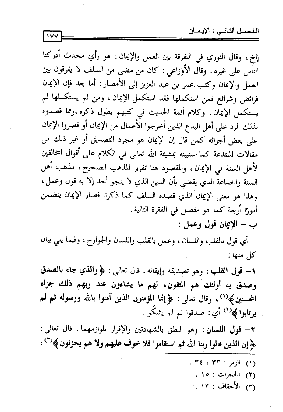 إلخ وقال الثوري في التفرقة بين العمل والإيمان: هُوَ رَأْيٌ مُحْدَثٌ أَدْرَكْنَا النَّاسَ عَلَى غَيْرِهِ. وَقَالَ الْأَوْزَاعِيُّ: كَانَ مَنْ مَضَى مِنَ السَّلَفِ لَا يُفَرِّقُونَ بَيْنَ الْعَمَلِ وَالْإِيمَانِ وَكَتَبَ عُمَرُ بْنُ عَبْدِ الْعَزِيزِ إِلَى الْأَمْصَارِ: أَمَّا بَعْدُ فإن الإيمان فرائض وشرائع فمن استكملها فقد اسْتَكْمَلَ الْإِيمَانَ، وَمَنْ لَمْ يَسْتَكْمِلْهَا لَمْ يَسْتَكْمِلِ الإيمان. وكلام أئمة الحديث في كتبهم يطول ذكره، وَمِمَّا قَصَدُوهُ بِذَلِكَ الرَّدُّ عَلَى أَهْلِ الْبِدَعِ الذين أخرجوا الأعمال من الإيمان أو قصروا الإيمان على بعض أجزائه كمن قال إن الإيمان هو مجرد التصديق أو غير ذلك من مقالات المبتدعة كما سنبينه بمشيئة الله تعالى في الكلام على أقوال المخالفين لأهل السنة من الإيمان، والمقصود هنا تقرير المذهب الصحيح، مذهب أهل السنة والجماعة الذي يقضي بأن الدين الذي لا ينجوا أحد إلا به قول أو عمل، هذا هو معنى الإيمان الذي قصده السلف كما ذكرنا فصار الإيمان يتضمن أموراً أربعة كما هو مفصل في الفقرة التالية.
