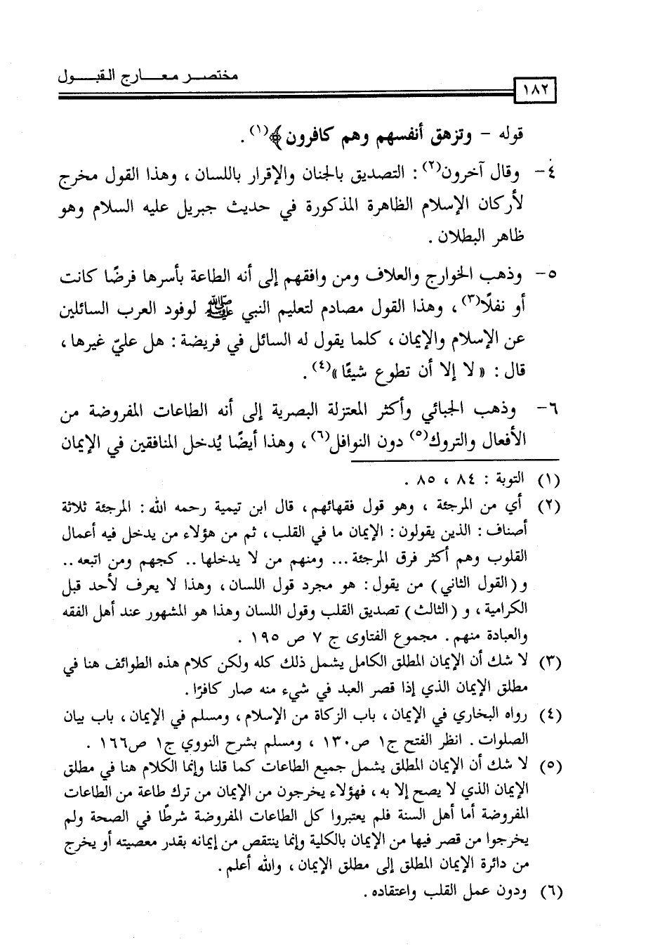 (¬5) لاشك أن الإيمان المطلق يشمل جميع الطاعات كما قلنا وإنما الكلام هنا في مطلق الإيمان الذي لا يصح إلا به، فهؤلاء يخرجون من الإيمان من ترك طاعة من الطاعات المفروضة أما أهل السنة فلم يعتبروا كل الطاعات المفروضة شرطاً في الصحة ولم يخرجوا من قصر فيها من الإيمان بالكلية وإنما ينتقص من إيمانه بقدر معصيته أو يخرج من دائرة الإيمان المطلق إلى مطلق الإيمان، والله أعلم.