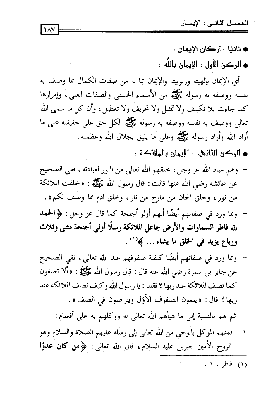 أي الإيمان بإلهيته وربوبيته والإيمان بما ليس من صفات الْكَمَالِ مِمَّا وَصَفَ بِهِ نَفْسَهُ وَوَصَفَهُ بِهِ رَسُولُهُ - صَلَّى اللَّهُ عَلَيْهِ وَسَلَّمَ - مِنَ الْأَسْمَاءِ الْحُسْنَى وَالصِّفَاتِ الْعُلَى، وَإِمْرَارُهَا كَمَا جَاءَتْ بِلَا تَكْيِيفٍ وَلَا تَمْثِيلٍ وَلَا تَحْرِيفٍ وَلَا تَعْطِيلٍ، وَأَنَّ كُلَّ مَا سَمَّى اللَّهُ تَعَالَى وَوَصَفَ بِهِ نَفْسَهُ وَوَصَفَهُ بِهِ رَسُولُهُ - صَلَّى اللَّهُ عَلَيْهِ وَسَلَّمَ - الْكُلُّ حَقٌّ عَلَى حَقِيقَتِهِ عَلَى ما أراد الله وأراد رسوله - صلى الله عليه وسلم - وعلى ما يليق بجلال الله وعظمته.