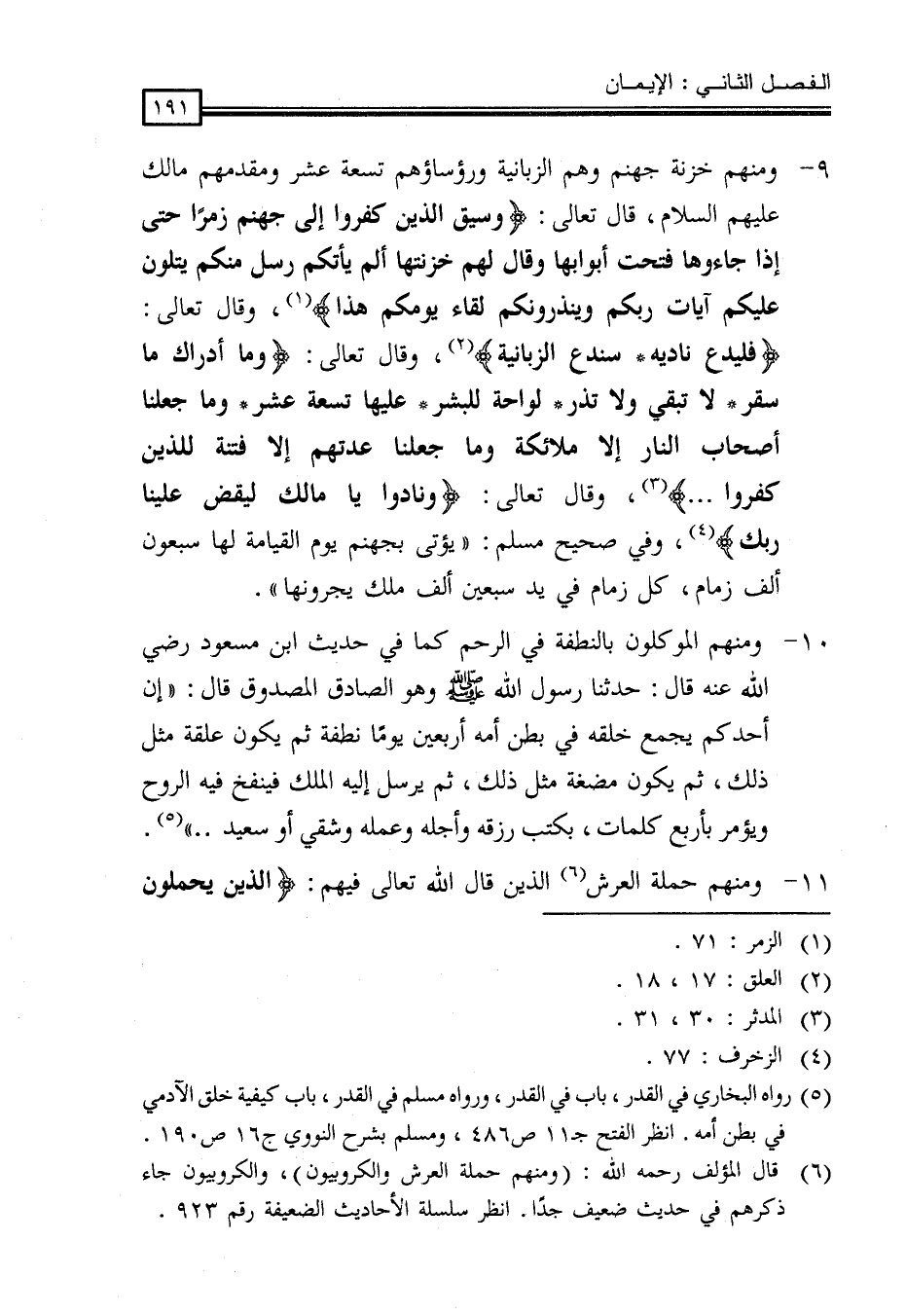 (¬6) قال المؤلف رحمه الله: (ومنهم حملة العرش والكروبيون) ، والكروبيون جاء ذكرهم في حديث ضعيف جداً. انظر سلسة الأحاديث الضعيفة رقم 923.