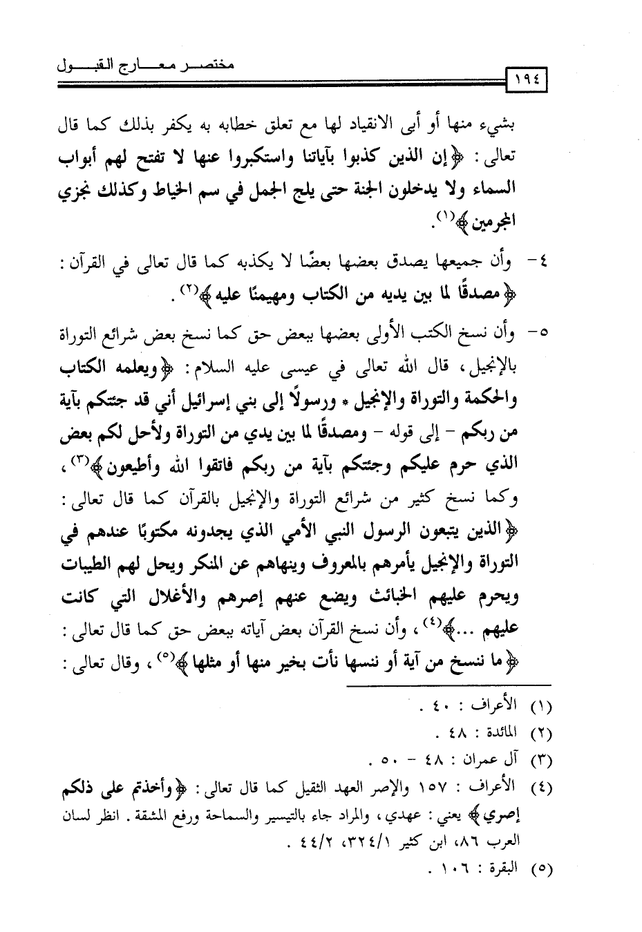 5-وَأَنَّ نَسْخَ الْكُتُبِ الْأُولَى بَعْضِهَا بِبَعْضٍ حَقٌّ كَمَا نُسِخَ بَعْضُ شَرَائِعِ التَّوْرَاةِ بِالْإِنْجِيلِ، قَالَ الله تعالى في عيسى عليه السلام: {وَيُعَلِّمُهُ الْكِتَابَ وَالْحِكْمَةَ وَالتَّوْرَاةَ وَالْإِنْجِيلَ * وَرَسُولًا إِلَى بَنِي إِسْرَائِيلَ أَنِّي قَدْ جِئْتُكُمْ بِآيَةٍ مِنْ رَبِّكُمْ - إِلَى قَوْلِهِ - وَمُصَدِّقًا لِمَا بَيْنَ يَدَيَّ مِنَ التَّوْرَاةِ وَلِأُحِلَّ لَكُمْ بَعْضَ الَّذِي حُرِّمَ عَلَيْكُمْ وَجِئْتُكُمْ بِآيَةٍ مِنْ رَبِّكُمْ فَاتَّقُوا اللَّهَ وأطيعون} (¬3) ، وَكَمَا نُسِخَ كَثِيرٌ مِنْ شَرَائِعِ التَّوْرَاةِ وَالْإِنْجِيلِ بالقرآن كما قال تعالى: {الَّذِينَ يَتَّبِعُونَ الرَّسُولَ النَّبِيَّ الْأُمِّيَّ الَّذِي يَجِدُونَهُ مَكْتُوبًا عِنْدَهُمْ فِي التَّوْرَاةِ وَالْإِنْجِيلِ يَأْمُرُهُمْ بِالْمَعْرُوفِ وَيَنْهَاهُمْ عَنِ الْمُنْكَرِ وَيُحِلُّ لَهُمُ الطَّيِّبَاتِ وَيُحَرِّمُ عَلَيْهِمُ الْخَبَائِثَ وَيَضَعُ عَنْهُمْ إِصْرَهُمْ وَالْأَغْلَالَ الَّتِي كانت عليهم ... } (¬4) ، وأن نسخ القرآن بعض آياته بعض حق كما قال تعالى: {ما نسخ مِنْ آيَةٍ أَوْ نُنْسِهَا نَأْتِ بِخَيْرٍ مِنْهَا أو مثلها} (¬5) ، وقال تعالى: