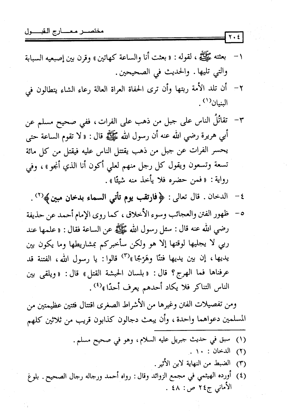5- ظهور الفتن والعجائب وسوء الأخلاق، كما روى الإمام أحمد عن حذيفة رَضِيَ اللَّهُ عَنْهُ قَالَ: سُئِلَ رَسُولُ اللَّهِ - صَلَّى اللَّهُ عَلَيْهِ وَسَلَّمَ - عَنِ السَّاعَةِ فَقَالَ: (عِلْمُهَا عِنْدَ رَبِّي لَا يُجَلِّيهَا لِوَقْتِهَا إِلَّا هُوَ وَلَكِنْ سَأُخْبِرُكُمْ بِمَشَارِيطِهَا وَمَا يَكُونُ بَيْنَ يديها، إن بين يديها فتناً وهَرْجاً) (¬3) قَالُوا: يَا رَسُولَ اللَّهِ، الْفِتْنَةُ قَدْ عَرَفْنَاهَا فَمَا الْهَرْجُ؟ قَالَ: (بِلِسَانِ الْحَبَشَةِ الْقَتْلُ) قَالَ: (وَيُلْقَى بَيْنَ النَّاسِ التَّنَاكُرُ فَلَا يَكَادُ أحدهم يعرف أحداً) (¬4) .