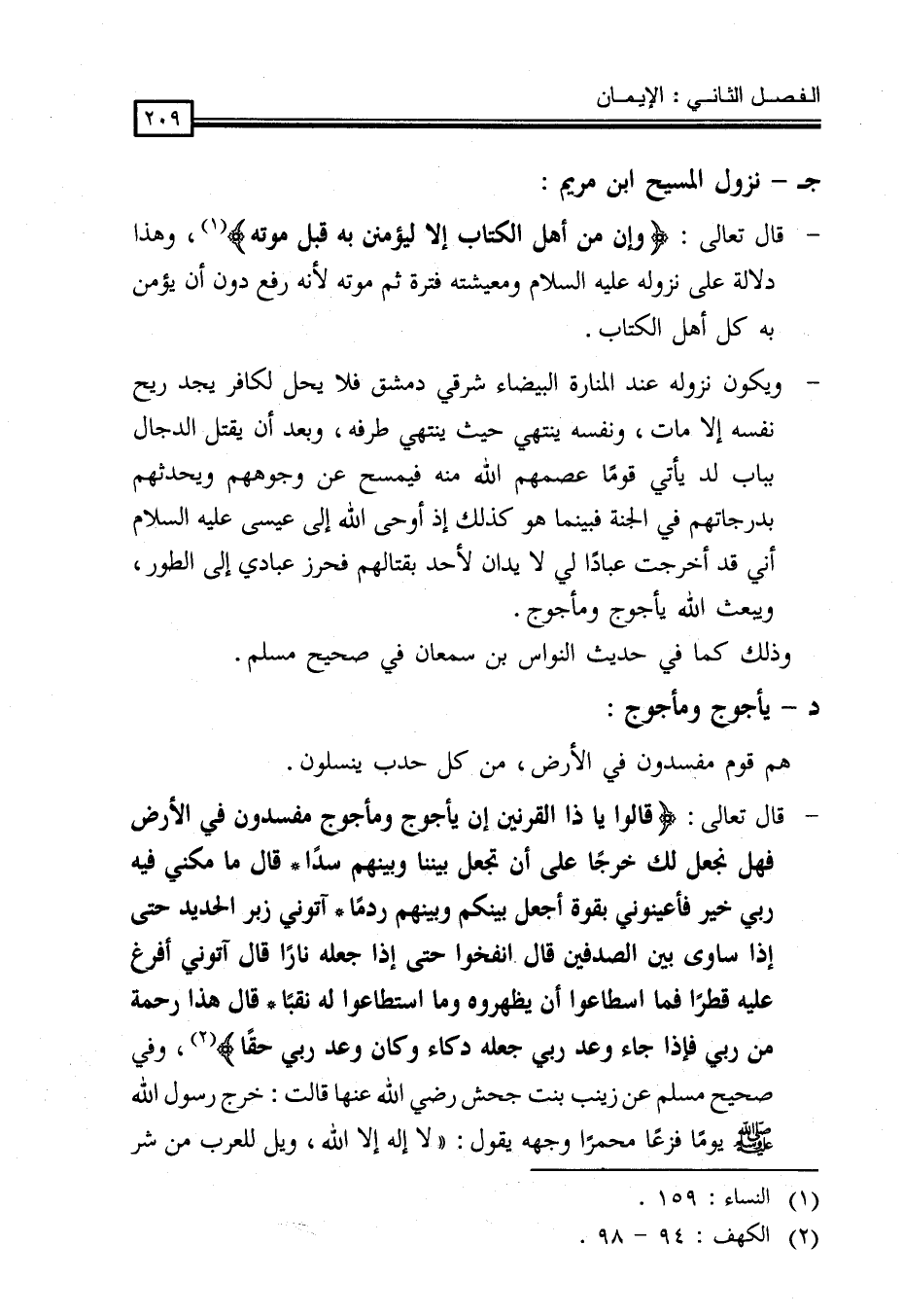 -قال تعالى: {وَإِنْ مِنْ أَهْلِ الْكِتَابِ إِلَّا لَيُؤْمِنَنَّ بِهِ قبل موته} (¬1) ، وهذا دلالة على نزوله عليه السلام ومعيشته فترة ثم موته لأنه رفع دون أن يؤمن به كل أهل الكتاب.