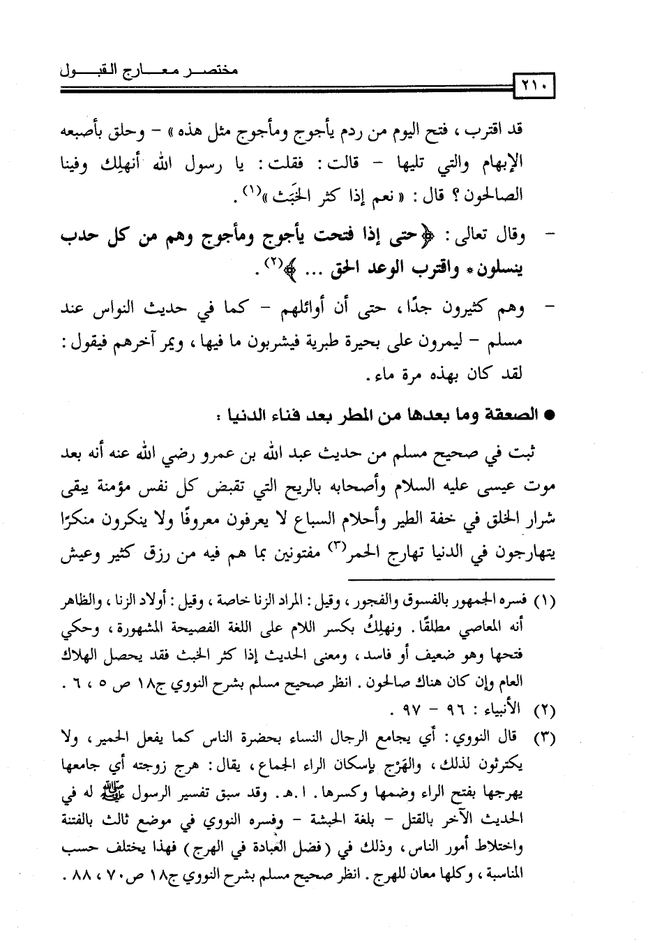ثبت في صحيح مسلم من حديث عَبْدِ اللَّهِ بْنِ عَمْرٍو رَضِيَ اللَّهُ عَنْهُ أنه بعد موت عيسى عليه السلام وأصحابه بالريح التي تقبض كل نفس مؤمنة يبقى شرار الخلق فِي خِفَّةِ الطَّيْرِ وَأَحْلَامِ السِّبَاعِ لَا يَعْرِفُونَ معروفاً ولا ينكرون منكراً يتهارجون في الدنيا تهارج الحمر (¬3) مفتونين بما هم فيه من رزق كثير وعيش