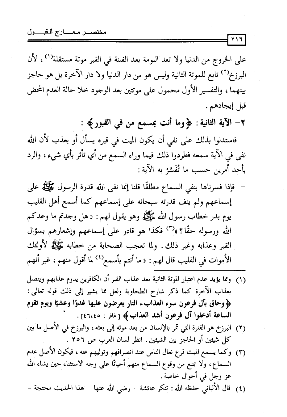 (¬1) ومما يؤيد عدم اعتبار الموتة الثانية بعد عذاب القبر أن الكافرين يدوم عذابهم ويتصل بعذاب الآخرة كما ذكر شارح الطحاوية ولعل ما يشير إلى ذلك قوله تَعَالَى: