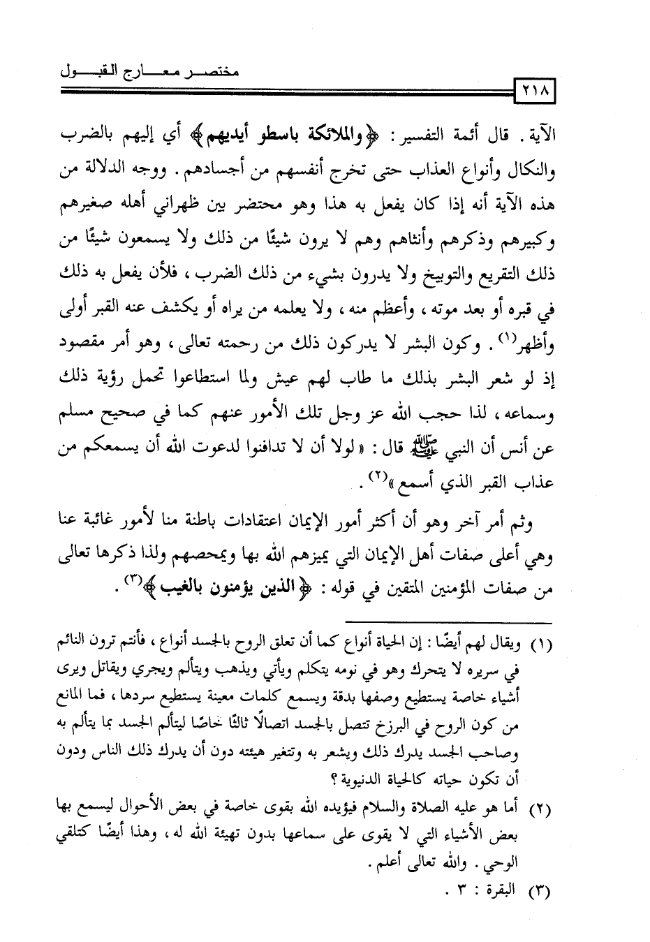 الآية. قال أئمة التفسير: {الملائكة باسطو أيديهم} أَيْ إِلَيْهِمْ بِالضَّرْبِ وَالنَّكَالِ وَأَنْوَاعِ الْعَذَابِ حَتَّى تخرج أنفسهم من أجسادهم. وَوَجْهُ الدَّلَالَةِ مِنْ هَذِهِ الْآيَةِ أَنَّهُ إِذَا كان يفعل بهذا وَهُوَ مُحْتَضِرٌ بَيْنَ ظَهَرَانَيْ أَهْلِهِ صَغِيرِهِمْ وَكَبِيرِهِمْ وذكرهم وأنثاهم ولا يدرون بشيء من ذلك الضرب، فلأن يفعل به ذلك في قبره أو بعد موته، وأعظم منه، ولا يعلمه من يراه أو يكشف عنه القبر أولى وأظهر (¬1) . وكون البشر لا يدركون ذلك من رحمته تعالى، وهو أمر مقصود إذ لو شعر البشر بذلك ما طاب لهم عيش ولما استطاعوا تحمل رؤية ذلك وسماعه، لذ حجب الله عز وجل تلك الأمور عنهم كما في صحيح مسلم عن آنس أَنَّ النَّبِيَّ - صَلَّى اللَّهُ عَلَيْهِ وَسَلَّمَ - قَالَ: (لَوْلَا أَنْ لَا تَدَافَنُوا لَدَعَوْتُ اللَّهَ أَنْ يسمعكم من عذاب القبر الذي أسمع) (¬2) .