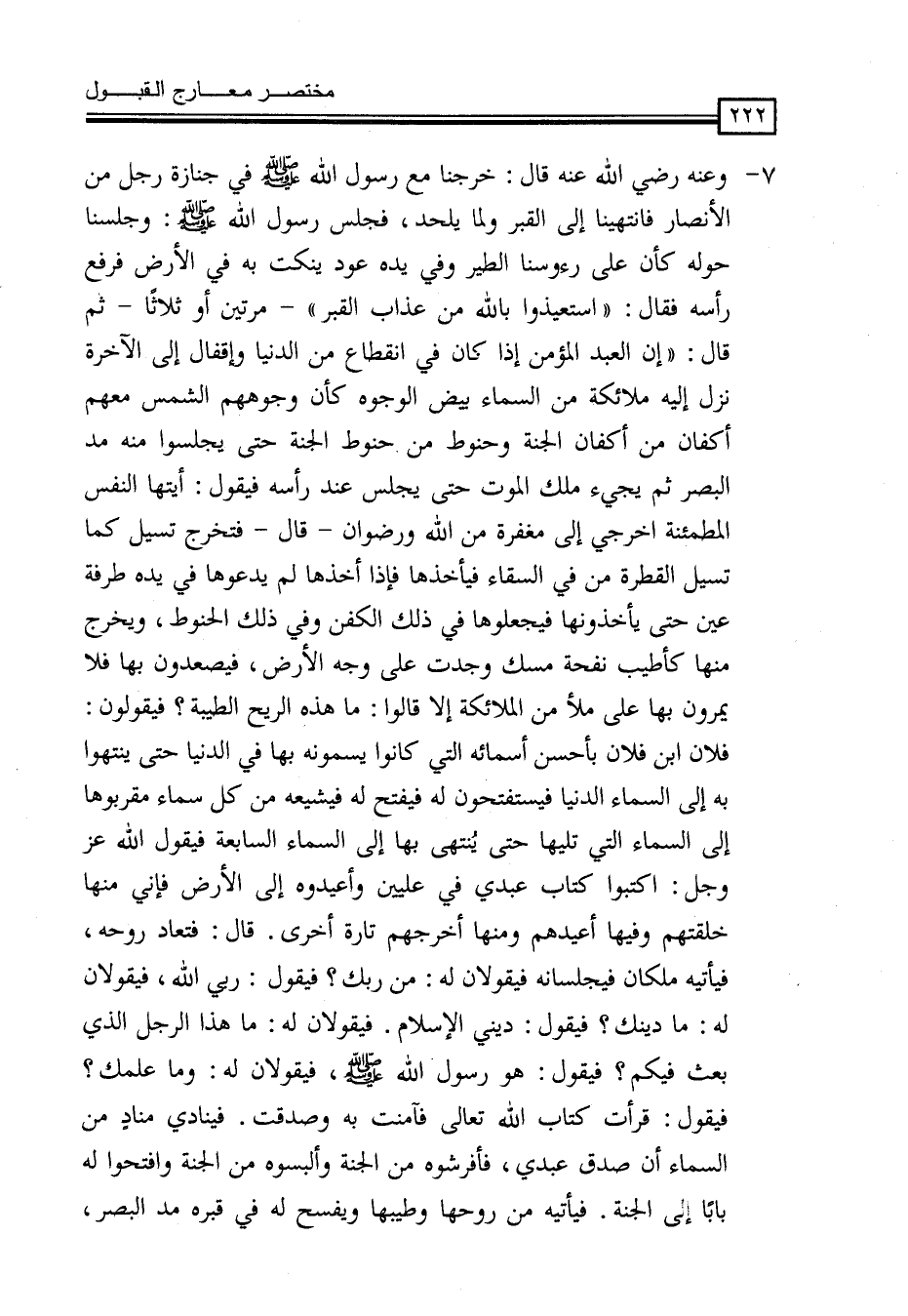 7-وعنه رَضِيَ اللَّهُ عَنْهُ قَالَ: خَرَجْنَا مَعَ رَسُولِ اللَّهِ - صَلَّى اللَّهُ عَلَيْهِ وَسَلَّمَ - فِي جِنَازَةِ رَجُلٍ مِنَ الْأَنْصَارِ فَانْتَهَيْنَا إِلَى الْقَبْرِ وَلَمَّا يلحد، فجلس النبي - صَلَّى اللَّهُ عَلَيْهِ وَسَلَّمَ -: وَجَلَسْنَا حَوْلَهُ كَأَنَّ عَلَى رُءُوسِنَا الطَّيْرَ وَفِي يَدِهِ عُودٌ يَنْكُتُ بِهِ فِي الْأَرْضِ فَرَفَعَ رَأْسَهُ فَقَالَ: (اسْتَعِيذُوا بِاللَّهِ مِنْ عَذَابِ الْقَبْرِ) – مَرَّتَيْنِ أَوْ ثَلَاثًا – ثُمَّ قَالَ: إِنَّ الْعَبْدَ الْمُؤْمِنَ إِذَا كَانَ فِي انْقِطَاعٍ مِنَ الدُّنْيَا وَإِقْفَالٍ إِلَى الْآخِرَةِ نزل إليه الملائكة من السماء بيض الوجوه كأن وجوهم الشمس معهم أكفان مِنْ أَكْفَانِ الْجَنَّةِ وَحَنُوطٌ مِنْ حَنُوطِ الْجَنَّةِ حَتَّى يَجْلِسُوا مِنْهُ مَدَّ الْبَصَرِ ثُمَّ يَجِيءُ ملك الموت حتى يجلس عند رأسه فيقول: أيتها النفس المطمئنة اخْرُجِي إِلَى مَغْفِرَةٍ مِنَ اللَّهِ وَرِضْوَانٍ – قَالَ – فتخرج تسيل كما تسيل القطرة من السِّقَاءِ فَيَأْخُذُهَا فَإِذَا أَخَذَهَا لَمْ يَدَعُوهَا فِي يده طرفة عين حتى يأخذونها فَيَجْعَلُوهَا فِي ذَلِكَ الْكَفَنِ وَفِي ذَلِكَ الْحَنُوطِ، ويخرج منها كأطيب نفخة مِسْكٍ وُجِدَتْ عَلَى وَجْهِ الْأَرْضِ، فَيَصْعَدُونَ بِهَا فَلَا يَمُرُّونَ بِهَا عَلَى مَلَإٍ مِنَ الْمَلَائِكَةِ إلا قالوا: ما هذه الريح الطيبة؟ فيقولون: فلان ابن فُلَانٍ بِأَحْسَنِ أَسْمَائِهِ الَّتِي كَانُوا يُسَمُّونَهُ بِهَا في الدنيا حتى ينتهوا به إلى السماء الدنيا فيستفتحون له فيفتح لَهُ فَيُشَيِّعُهُ مِنْ كُلِّ سَمَاءٍ مُقَرَّبُوهَا إِلَى السماء التي تليها حتى يُنتهى بها إِلَى السَّمَاءِ السَّابِعَةِ فَيَقُولُ اللَّهُ عَزَّ وَجَلَّ: اكْتُبُوا كِتَابَ عَبْدِي فِي عِلِّيِّينَ وَأَعِيدُوهُ إِلَى الْأَرْضِ فَإِنِّي مِنْهَا خَلَقْتُهُمْ وَفِيهَا أُعِيدُهُمْ وَمِنْهَا أخرجهم تارة أخرى. قال فتعاد روحه، فَيَأْتِيهِ مَلَكَانِ فَيُجْلِسَانِهِ فَيَقُولَانِ لَهُ: مَنْ رَبُّكَ؟ فَيَقُولُ رَبِّيَ اللَّهُ، فَيَقُولَانِ لَهُ: مَا دِينُكَ؟ فَيَقُولُ: دِينِيَ الْإِسْلَامُ. فَيَقُولَانِ لَهُ: مَا هَذَا الرَّجُلُ الَّذِي بُعِثَ فِيكُمْ؟ فَيَقُولُ: هُوَ رَسُولُ اللَّهِ - صَلَّى اللَّهُ عَلَيْهِ وَسَلَّمَ -، فَيَقُولَانِ لَهُ: وما علمك؟ فيقول: قرأت كتاب الله تعالى فآمنت به وصدقت. فينادي منادٍ من السَّمَاءِ أَنْ صَدَقَ عَبْدِي، فَأَفْرِشُوهُ مِنَ الْجَنَّةِ وَأَلْبِسُوهُ مِنَ الْجَنَّةِ وَافْتَحُوا لَهُ بَابًا إِلَى الحنة.