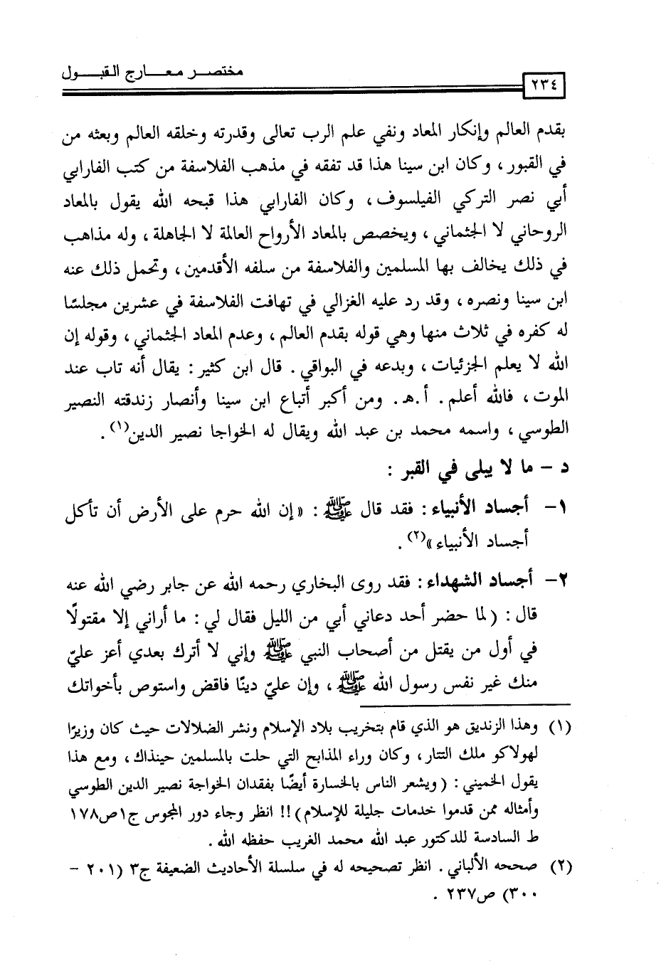 بِقِدَمِ الْعَالَمِ وَإِنْكَارِ الْمَعَادِ وَنَفْيِ عِلْمِ الرَّبِّ تَعَالَى وَقُدْرَتِهِ وَخَلْقِهِ الْعَالِمَ وَبَعْثِهُ مَنْ فِي القبور، وكان ابن سينا هذا قد تفقه في مَذْهَبَ الْفَلَاسِفَةِ مِنْ كُتُبِ الْفَارَابِيِّ أَبِي نَصْرٍ التُّرْكِيِّ الْفَيْلَسُوفِ، وَكَانَ الْفَارَابِيُّ هَذَا قَبَّحَهُ اللَّهُ يَقُولُ بِالْمَعَادِ الرُّوحَانِيِّ لَا الْجُثْمَانِيِّ، وَيُخَصِّصُ بِالْمَعَادِ الْأَرْوَاحَ الْعَالِمَةَ لَا الْجَاهِلَةَ، وَلَهُ مَذَاهِبُ فِي ذلك يخالف بها الْمُسْلِمِينَ وَالْفَلَاسِفَةَ مِنْ سَلَفِهِ الْأَقْدَمِينَ، وَتَحَمَّلَ ذَلِكَ عَنْهُ ابْنُ سِينَا وَنَصَرَهُ، وَقَدْ رَدَّ عَلَيْهِ الْغَزَالِيُّ فِي تَهَافُتِ الْفَلَاسِفَةِ فِي عِشْرِينَ مَجْلِسًا لَهُ كَفَّرَهُ فِي ثَلَاثٍ مِنْهَا وَهِيَ قَوْلُهُ بِقِدَمِ الْعَالَمِ، وَعَدَمِ الْمَعَادِ الْجُثْمَانِيِّ، وَقَوْلُهُ إِنَّ اللَّهَ لَا يَعْلَمُ الْجُزْئِيَّاتِ، وَبَدَّعَهُ فِي الْبَوَاقِي. قال ابن كثير: يقال أنه تاب عند الموت، فالله أعلم. أ. هـ. ومن أكبر أتباع ابن سينا وأنصار زندقته النَّصِيرُ الطُّوسِيُّ، وَاسْمُهُ مُحَمَّدُ بْنُ عَبْدِ اللَّهِ ويقال له الخواجا نصير الدين (¬1) .