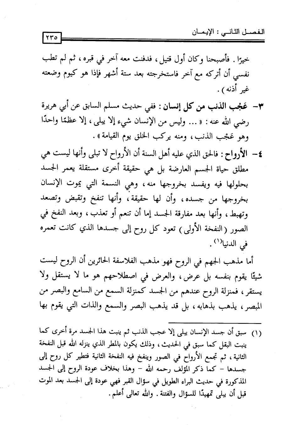 (¬1) سبق أن جسد الإنسان يبلى إلا عجب الذنب ثم ينبت هذا الجسد مرة أخرى كما ينبت البقل كما سبق في الحديث، وذلك يكون بالمطر الذي ينزله الله قبل النفخة الثانية، ثم تجمع الأرواح في الصور وينفخ فيه النفخة الثانية فتطير كل روح إلى جسدها - كما ذكر المؤلف رحمه الله - وهذا بخلاف عودة الروح إلى الجسد المذكورة في حديث البراء الطويل في سؤال القبر فهي عودة إلى الجسد بعد الموت قبل أن يبلى تمهيداً للسؤال والفتنة. والله تعالى أعلم.