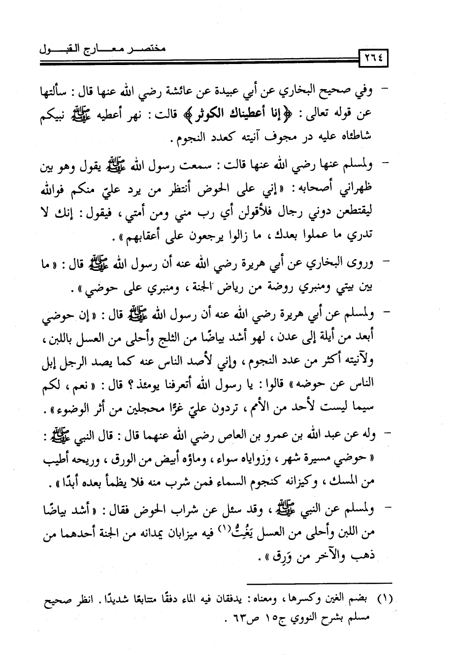 -وروى البخاري عَنْ أَبِي هُرَيْرَةَ رَضِيَ اللَّهُ عَنْهُ أَنَّ رسول الله - صلى الله عليه وسلم - قال: (مَا بَيْنَ بَيْتِي وَمِنْبَرِي رَوْضَةٌ مِنْ رِيَاضِ الجنة، ومنبري على حوضي) .