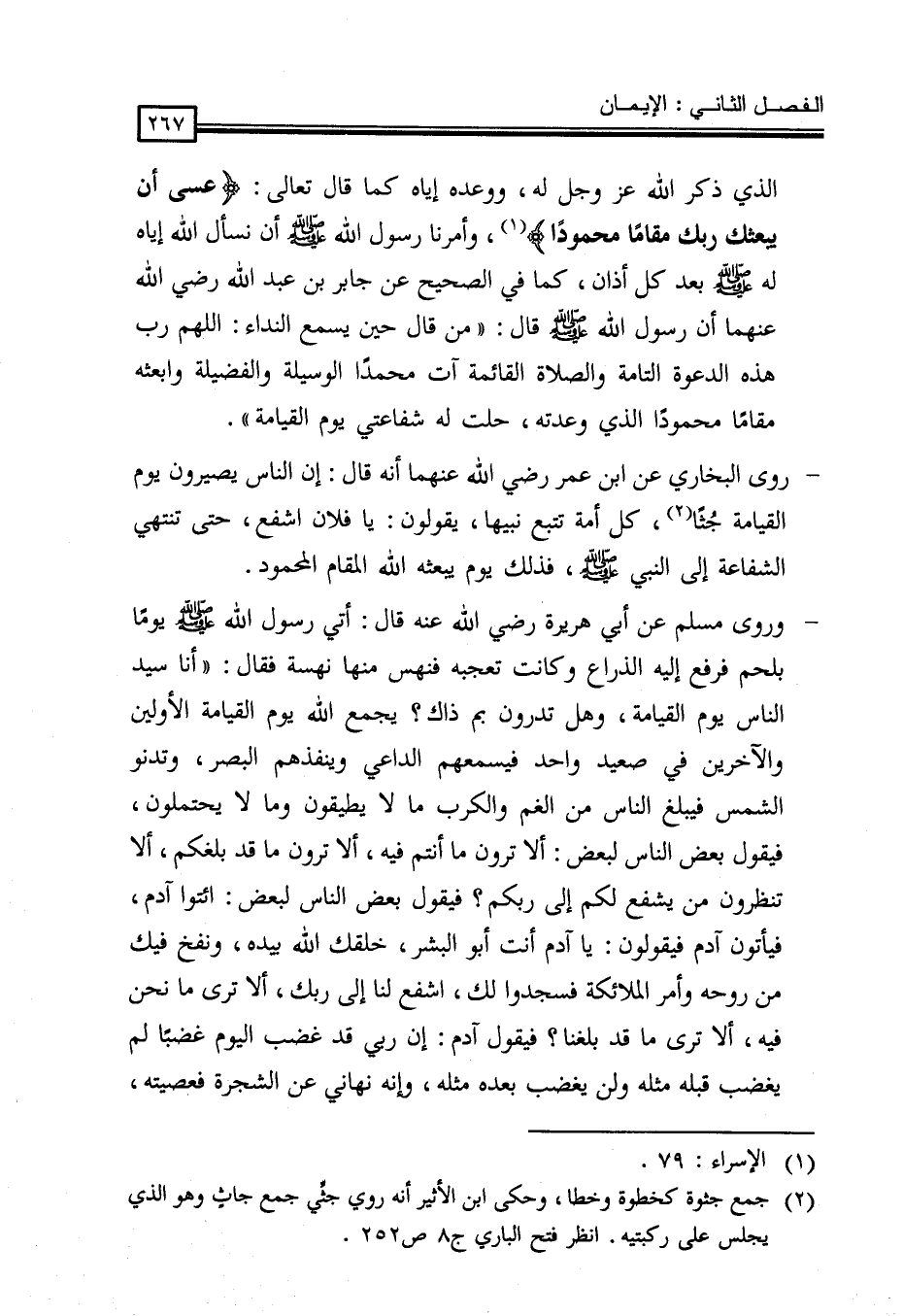 -وروى البخاري عن ابْنِ عُمَرَ رَضِيَ اللَّهُ عَنْهُمَا أَنَّهُ قَالَ: إِنَّ النَّاسَ يَصِيرُونَ يَوْمَ الْقِيَامَةِ جُثاً (¬2) ، كُلُّ أُمَّةٍ تَتْبَعُ نَبِيَّهَا، يَقُولُونَ: يَا فُلَانُ اشْفَعْ، حَتَّى تَنْتَهِيَ الشَّفَاعَةُ إِلَى النَّبِيِّ - صَلَّى اللَّهُ عَلَيْهِ وَسَلَّمَ -، فَذَلِكَ يَوْمَ يَبْعَثُهُ اللَّهُ الْمَقَامَ المحمود.