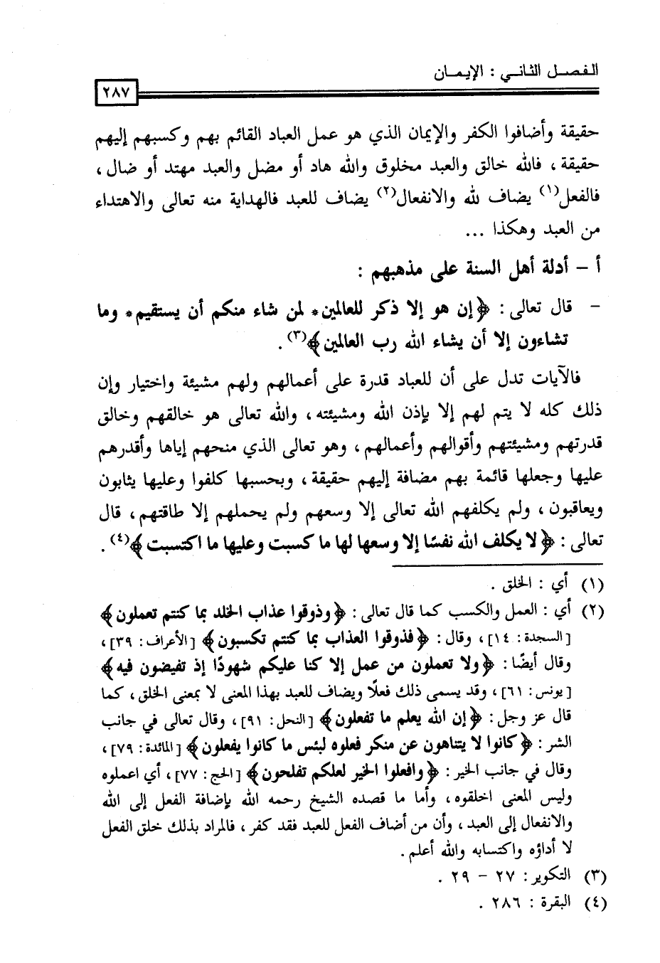 فالآيات تدل على أن للعباد قدرة على أعمالهم ولهم مشيئة واختيار وإن ذلك كله لا يتم لهم إلا بإذن الله ومشيئته، والله تعالى هو خَالِقُهُمْ وَخَالِقُ قُدْرَتِهِمْ وَمَشِيئَتِهِمْ وَأَقْوَالِهِمْ وَأَعْمَالِهِمْ، وَهُوَ تَعَالَى الَّذِي مَنَحَهُمْ إِيَّاهَا وَأَقْدَرَهُمْ عَلَيْهَا وَجَعَلَهَا قَائِمَةً بِهِمْ مُضَافَةً إِلَيْهِمْ حَقِيقَةً، وَبِحَسَبِهَا كُلِّفُوا وعليها يُثَابُونَ وَيُعَاقَبُونَ، وَلَمْ يُكَلِّفْهُمُ اللَّهُ تَعَالَى إِلَّا وسعهم ولم يحملهم إلا طاقتهم، قال تَعَالَى: {لَا يُكَلِّفُ اللَّهُ نَفْسًا إِلَّا وُسْعَهَا لما ما كسبت وعليها ما اكتسبت} (¬4) .