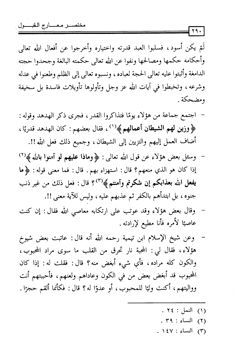 -وعن شيخ الإسلام ابن تيمية رحمه الله أنه قال: عتبت بَعْضَ شُيُوخِ هَؤُلَاءِ، فَقَالَ لِي: الْمَحَبَّةُ نَارٌ تَحْرِقُ مِنَ الْقَلْبِ مَا سِوَى مُرَادِ الْمَحْبُوبِ، وَالْكَوْنُ كُلُّهُ مُرَادُهُ، فَأَيُّ شَيْءٍ أَبْغَضُ مِنْهُ؟ قَالَ: فَقُلْتُ لَهُ: إِذَا كَانَ الْمَحْبُوبُ قَدْ أَبْغَضَ بَعْضَ مَنْ فِي الْكَوْنِ وَعَادَاهُمْ وَلَعَنَهُمْ فأحببتهم لأنت وَوَالَيْتَهُمْ، أَكُنْتَ وَلِيًّا لِلْمَحْبُوبِ، أَوْ عَدُوًّا لَهُ؟ قال: فكأنما ألقم حجراً.