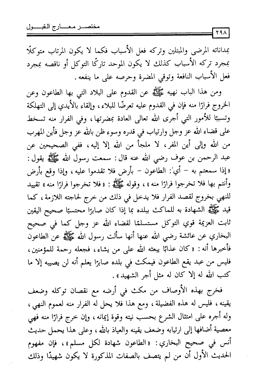 وَمِنْ هَذَا الْبَابِ نَهْيُهُ - صَلَّى اللَّهُ عَلَيْهِ وَسَلَّمَ - عَنِ الْقُدُومِ عَلَى الْبِلَادِ الَّتِي بِهَا الطاعون وعن الخروج فِرَارًا مِنْهُ فَإِنَّ فِي الْقُدُومِ عَلَيْهِ تَعَرُّضًا لِلْبَلَاءِ، وَإِلْقَاءً بِالْأَيْدِي إِلَى التَّهْلُكَةِ وَتَسَبُّبًا لِلْأُمُورِ الَّتِي أَجْرَى اللَّهُ تَعَالَى الْعَادَةَ بِمَضَرَّتِهَا، وَفِي الفرار منه تسخط على قضاء الله عز وجل وارتياب فِي قَدَرِهِ وَسُوءَ ظَنٍّ بِاللَّهِ عَزَّ وَجَلَّ فَأَيْنَ الْمَهْرَبُ مِنَ اللَّهِ وَإِلَى أَيْنَ الْمَفَرُّ، لا ملجأ من الله إلا إليه، ففي الصحيحين عن عَبْدِ الرَّحْمَنِ بْنِ عَوْفٍ رَضِيَ اللَّهُ عَنْهُ قَالَ: سَمِعْتُ رَسُولَ اللَّهِ - صَلَّى اللَّهُ عَلَيْهِ وسلم - يقول: (إذا سمعتم به - أي: الطاعون - بِأَرْضٍ فَلَا تَقْدَمُوا عَلَيْهِ، وَإِذَا وَقَعَ بِأَرْضٍ وأنتم بها فلا تخرجوا فراراً منه) ، وَقَوْلُهُ - صَلَّى اللَّهُ عَلَيْهِ وَسَلَّمَ -: (فَلَا تَخْرُجُوا فِرَارًا مِنْهُ) تَقْيِيدً لِلنَّهْيِ بِخُرُوجٍ لِقَصْدِ الْفِرَارِ فَلَا يَدْخُلُ فِي ذَلِكَ مَنْ خَرَجَ لِحَاجَتِهِ اللَّازِمَةِ، كَمَا قَيَّدَ - صَلَّى اللَّهُ عَلَيْهِ وَسَلَّمَ - الشَّهَادَةَ بِهِ لِلْمَاكِثِ بِبَلَدِهِ بِمَا إِذَا كَانَ صَابِرًا مُحْتَسِبًا صَحِيحَ الْيَقِينِ ثَابِتَ الْعَزِيمَةِ قَوِيَ التَّوَكُّلِ مُسْتَسْلِمًا لِقَضَاءِ اللَّهِ عَزَّ وَجَلَّ كَمَا في صحيح البخاري عن عائشة رضي الله عنها أَنَّهَا سَأَلْتُ رَسُولَ اللَّهِ - صَلَّى اللَّهُ عَلَيْهِ وَسَلَّمَ - عن الطاعون فأخبرها أَنَّهُ: (كَانَ عَذَابًا يَبْعَثُهُ اللَّهُ عَلَى مَنْ يشاء، فجعله رَحْمَةً لِلْمُؤْمِنِينَ، فَلَيْسَ مِنْ عَبْدٍ يَقَعُ الطَّاعُونُ فَيَمْكُثُ فِي بَلَدِهِ صَابِرًا يَعْلَمُ أَنَّهُ لَنْ يصيبه إلا ما كتب الله كَانَ لَهُ مِثْلُ أَجْرِ الشَّهِيدِ) .