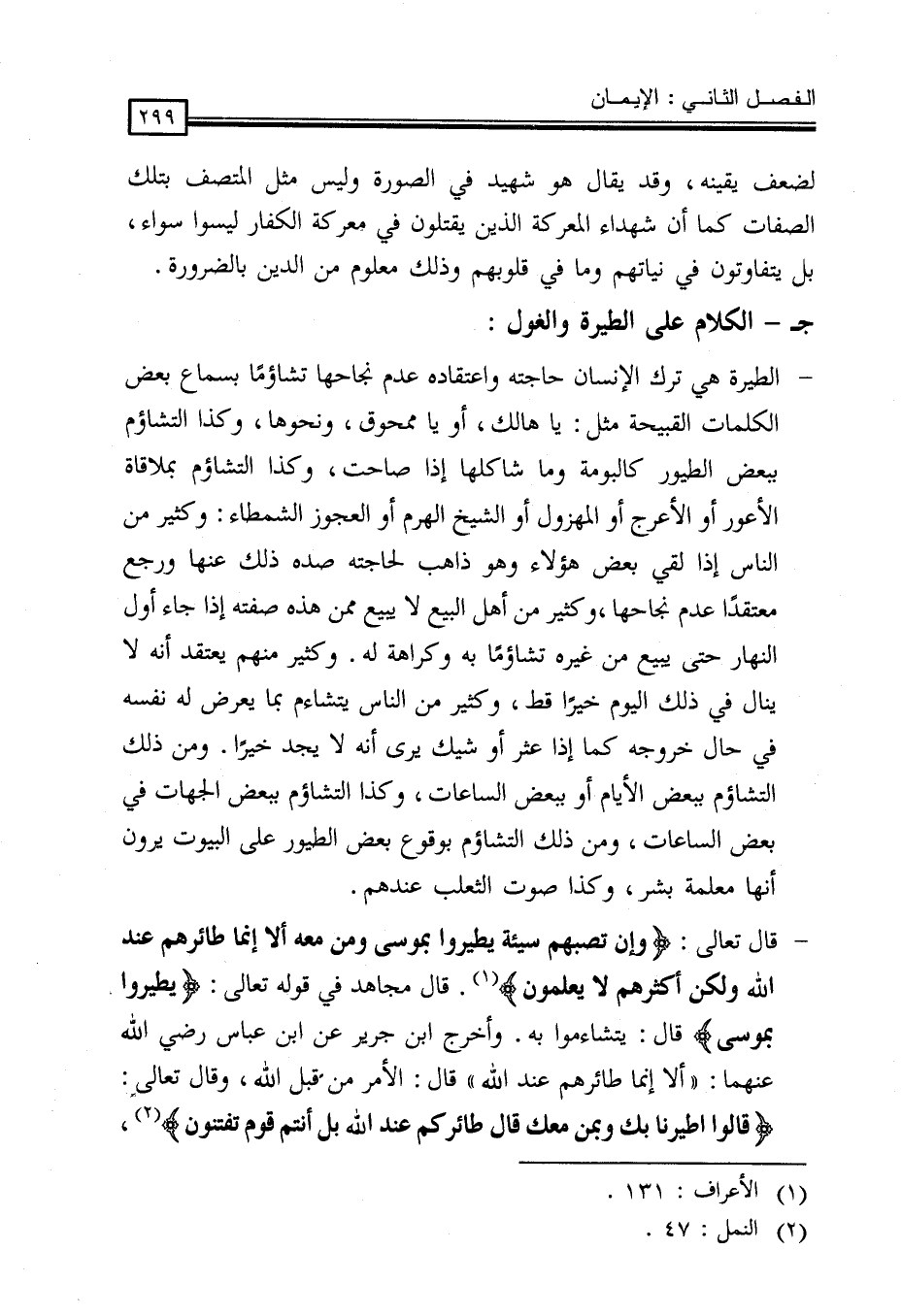 -قال تعالى: {وَإِنْ تُصِبْهُمْ سَيِّئَةٌ يَطَّيَّرُوا بِمُوسَى وَمَنْ مَعَهُ أَلَا إِنَّمَا طَائِرُهُمْ عِنْدَ اللَّهِ وَلَكِنَّ أَكْثَرَهُمْ لا يعلمون} (¬1) . قال مجاهد في قوله تعالى: {يَطَّيَّرُوا بِمُوسَى} قَالَ: يَتَشَاءَمُوا بِهِ. وَأَخْرَجَ ابْنُ جَرِيرٍ عَنِ ابْنِ عَبَّاسٍ رَضِيَ اللَّهُ عَنْهُمَا: (ألا إنما طائرهم عند الله) قال: الأمر من قبل الله، وقال تعالى: {قَالُوا اطَّيَّرْنَا بِكَ وَبِمَنْ مَعَكَ قَالَ طَائِرُكُمْ عند الله بل أنتم قوم تفتنون} (¬2) .