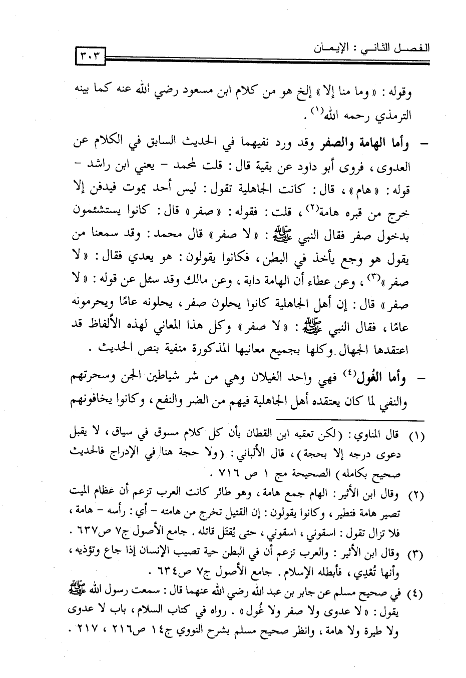 (¬4) في صحيح مسلم عَنْ جَابِرِ بْنِ عَبْدِ اللَّهِ رَضِيَ اللَّهُ عَنْهُمَا قَالَ: سَمِعْتُ رَسُولَ اللَّهِ - صَلَّى اللَّهُ عليه وسلم - يقول: (لا عدوى ولا صفر ولا غُول) . واه في كتاب السلام، باب لا عدوى ولا طيرة ولا هامة. وانظر صحيح مسلم بشرح النووي ج14 ص216، 217.